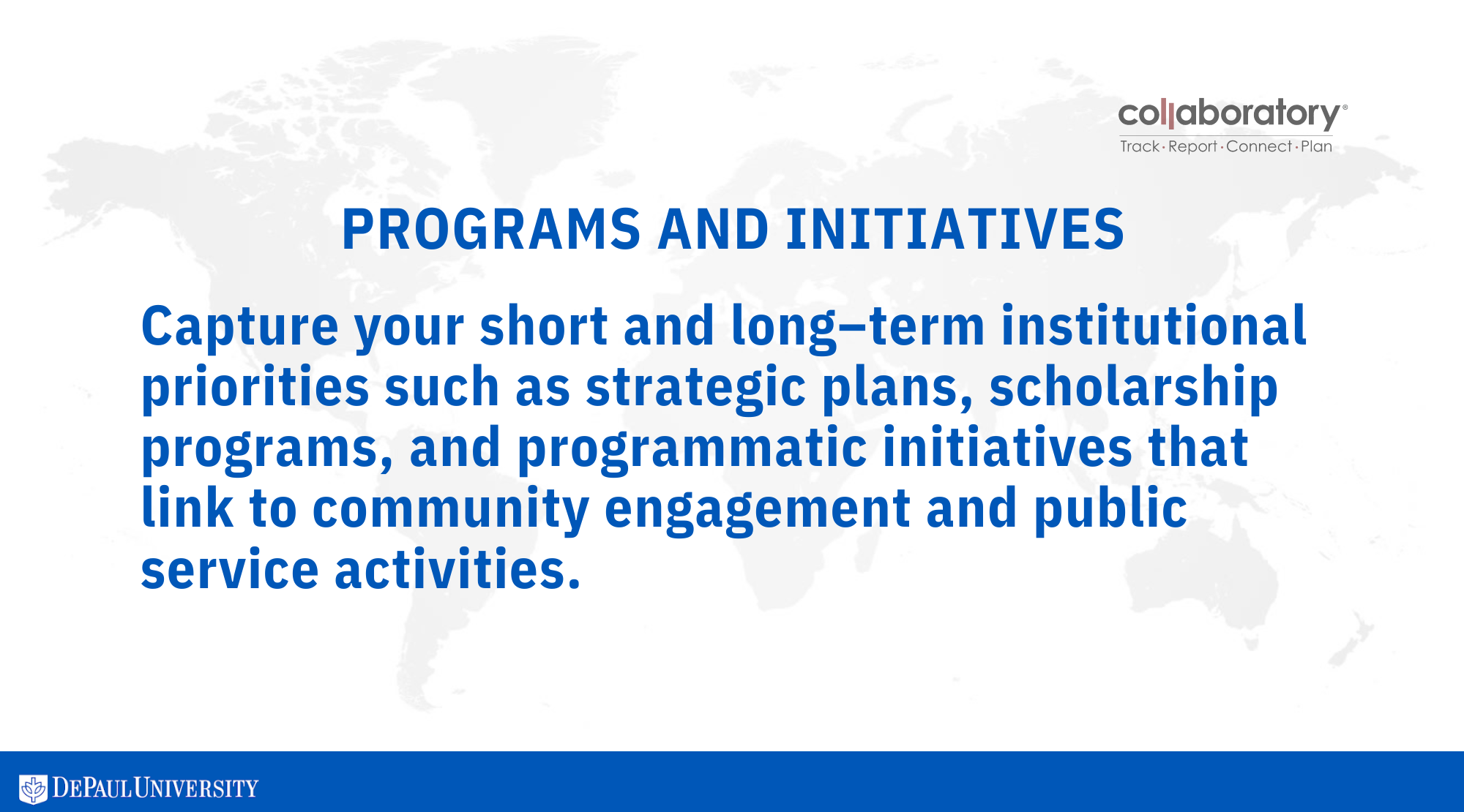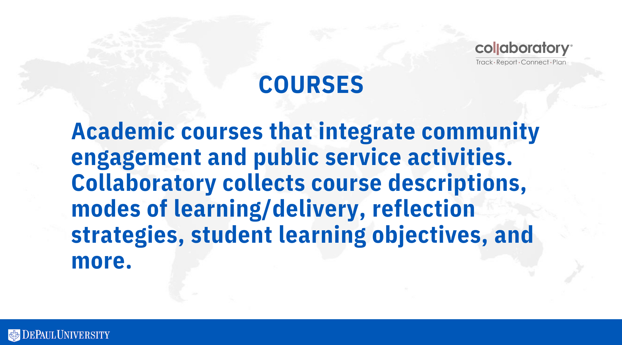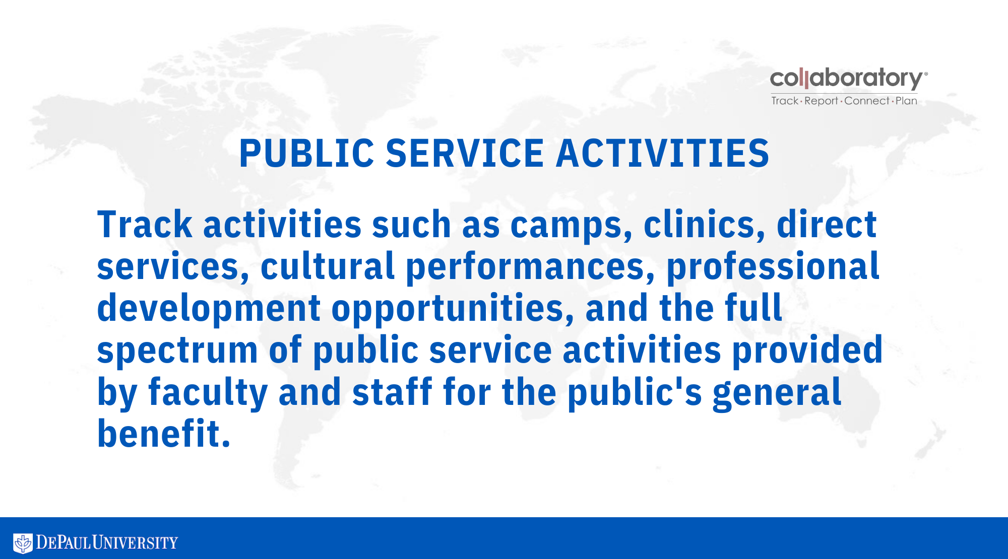 Collaboratory collects information about community engagement activities done in partnership with the community and public service activities providing expertise, resources, or services to or for the community.