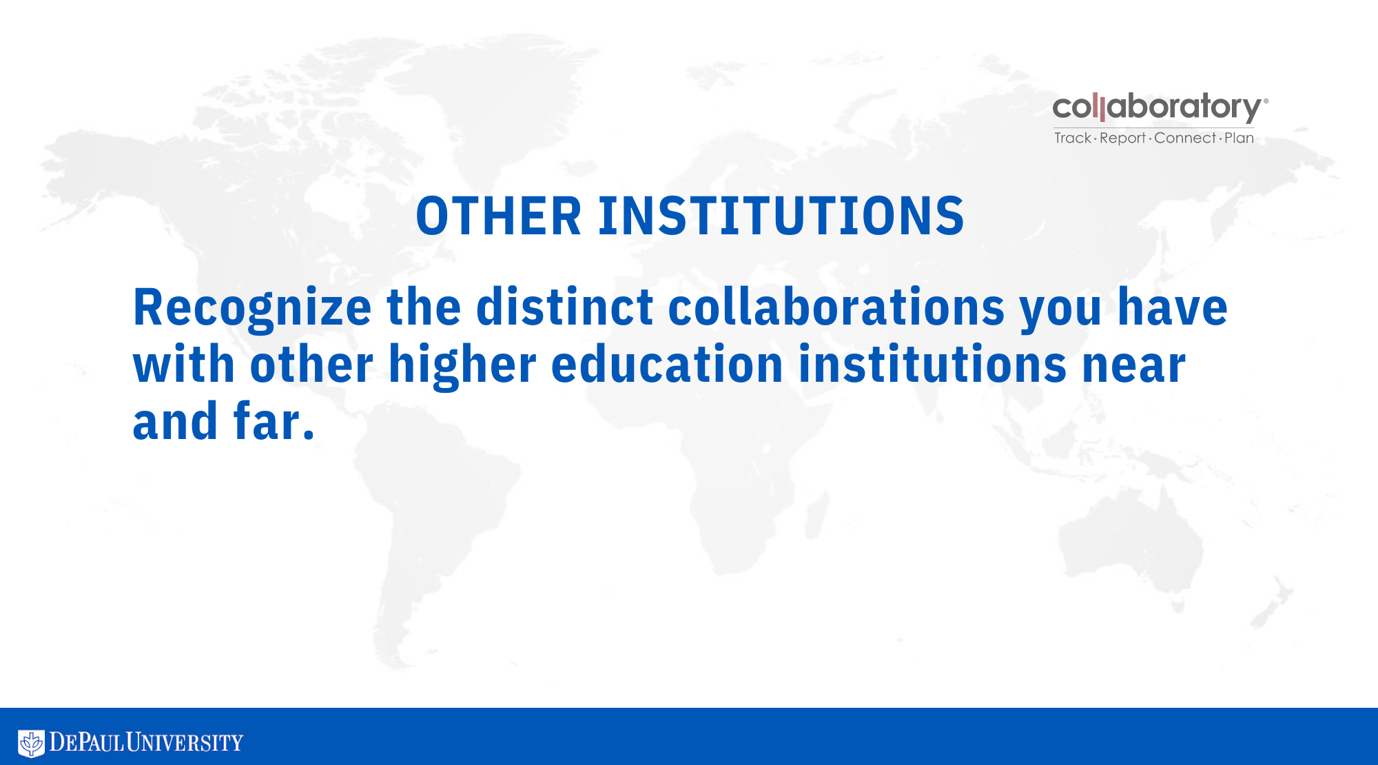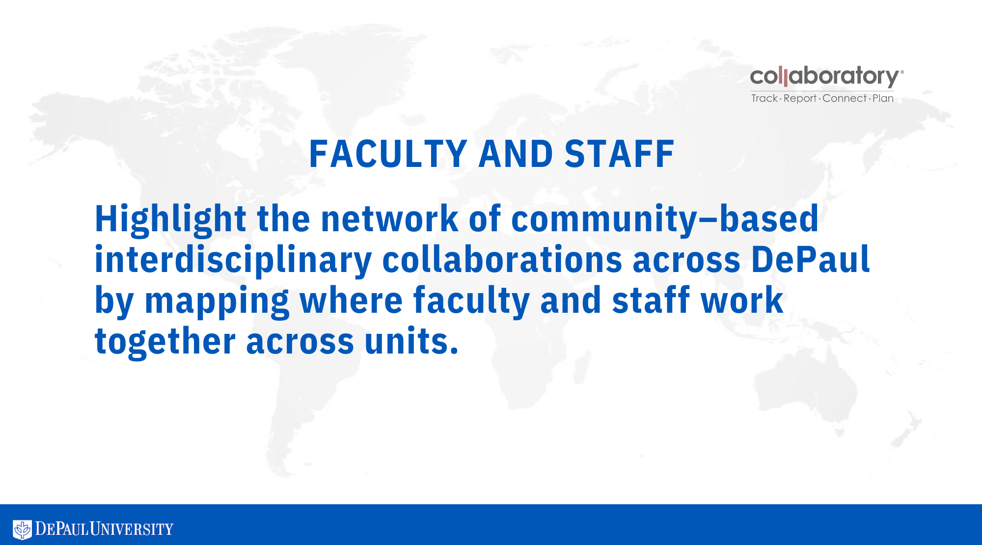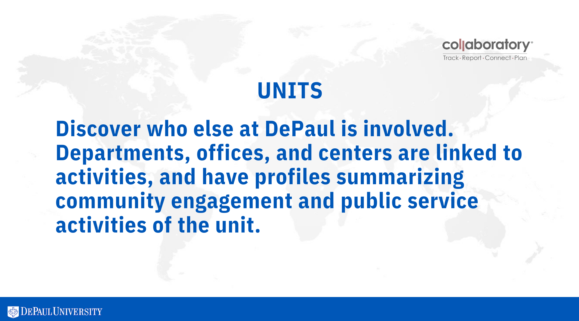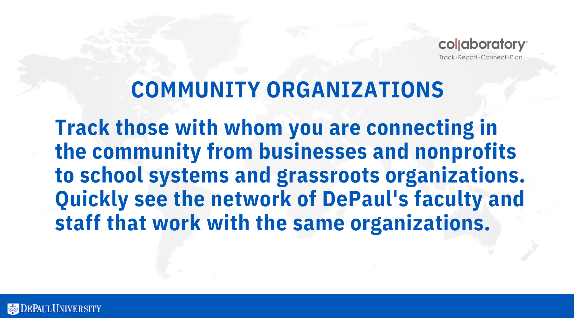 Collaboratory collects information about community engagement activities done in partnership with the community and public service activities providing expertise, resources, or services to or for the community.