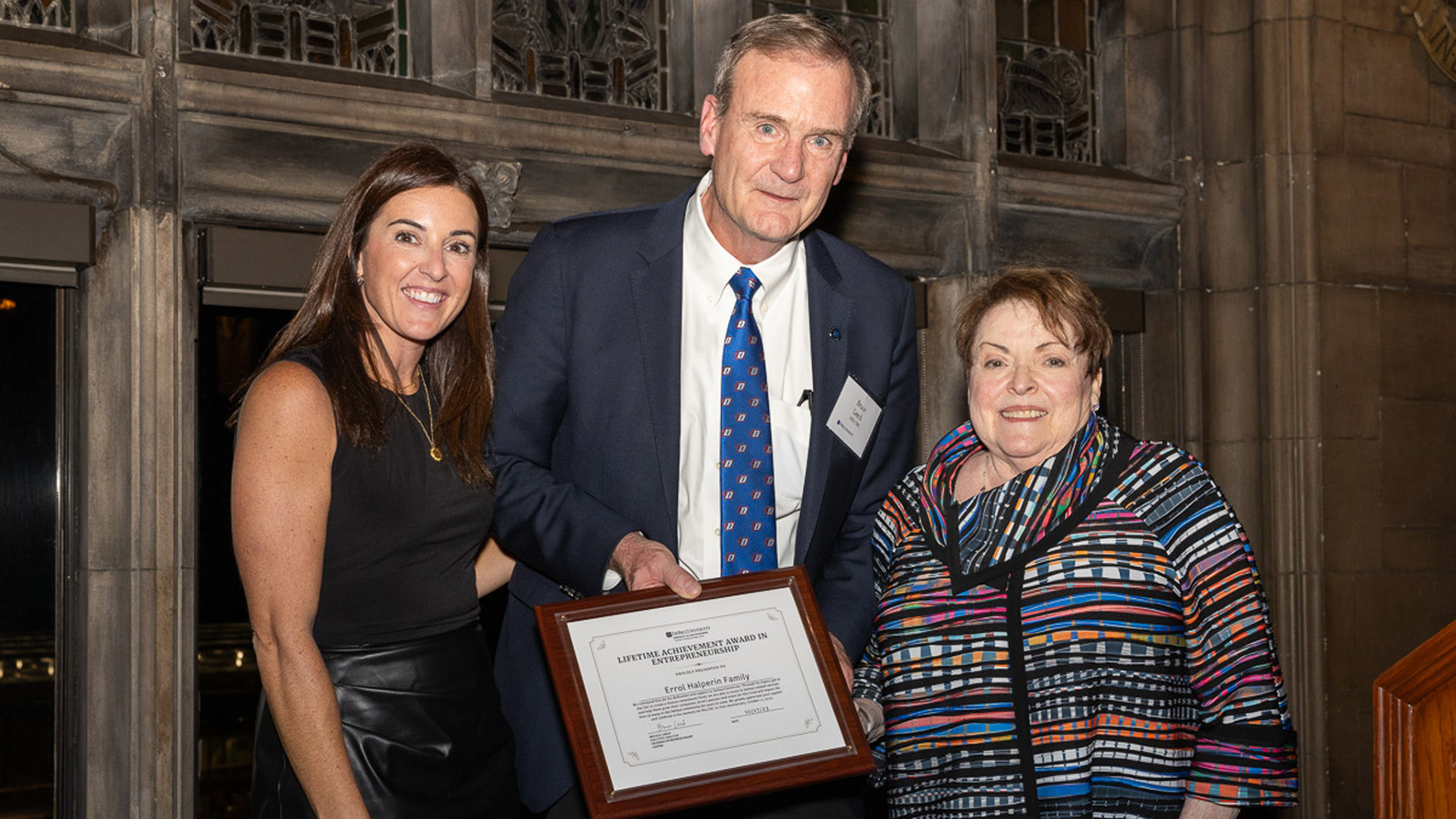 - The late Errol R. Halperin (BUS ’64, JD ’67), whose generous gift establishing the Halperin Emerging Company Fund has allowed the center to give back to the Chicago community, empower women-owned businesses (both businesses awarded funds so far are women-owned) and give students an inside perspective on the venture-funding process. Halperin’s sister, Phyllis Hollander, was present to accept the award.