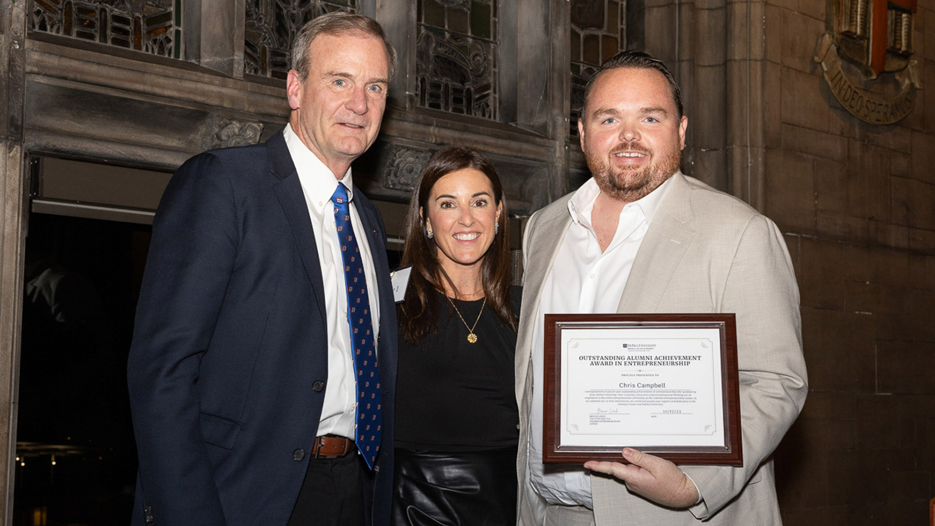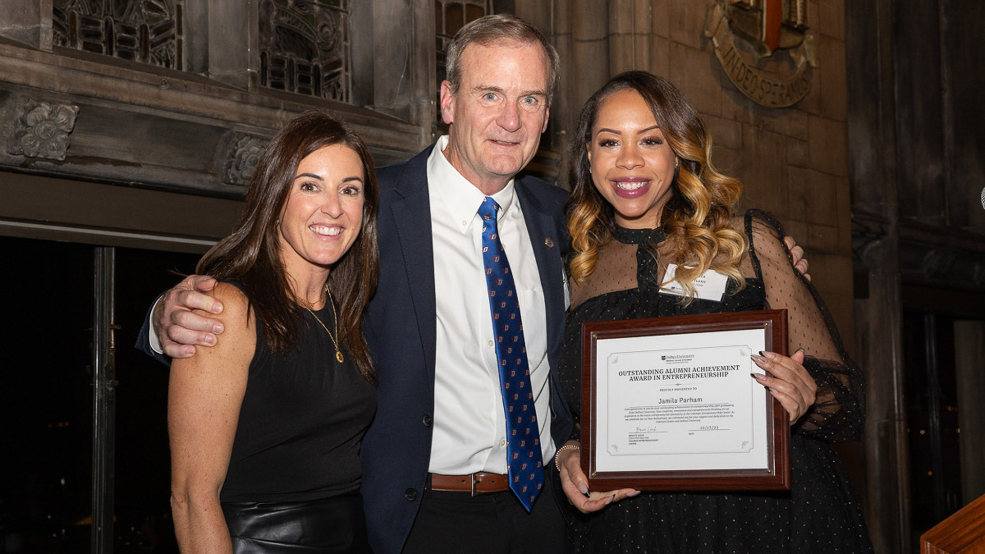- Entrepreneurs Jamila Parham (CDM ‘08) and Chris Campbell (CMN ‘09), who received alumni achievement awards for their extraordinary and wide-ranging impact on DePaul students and the Chicago community.
