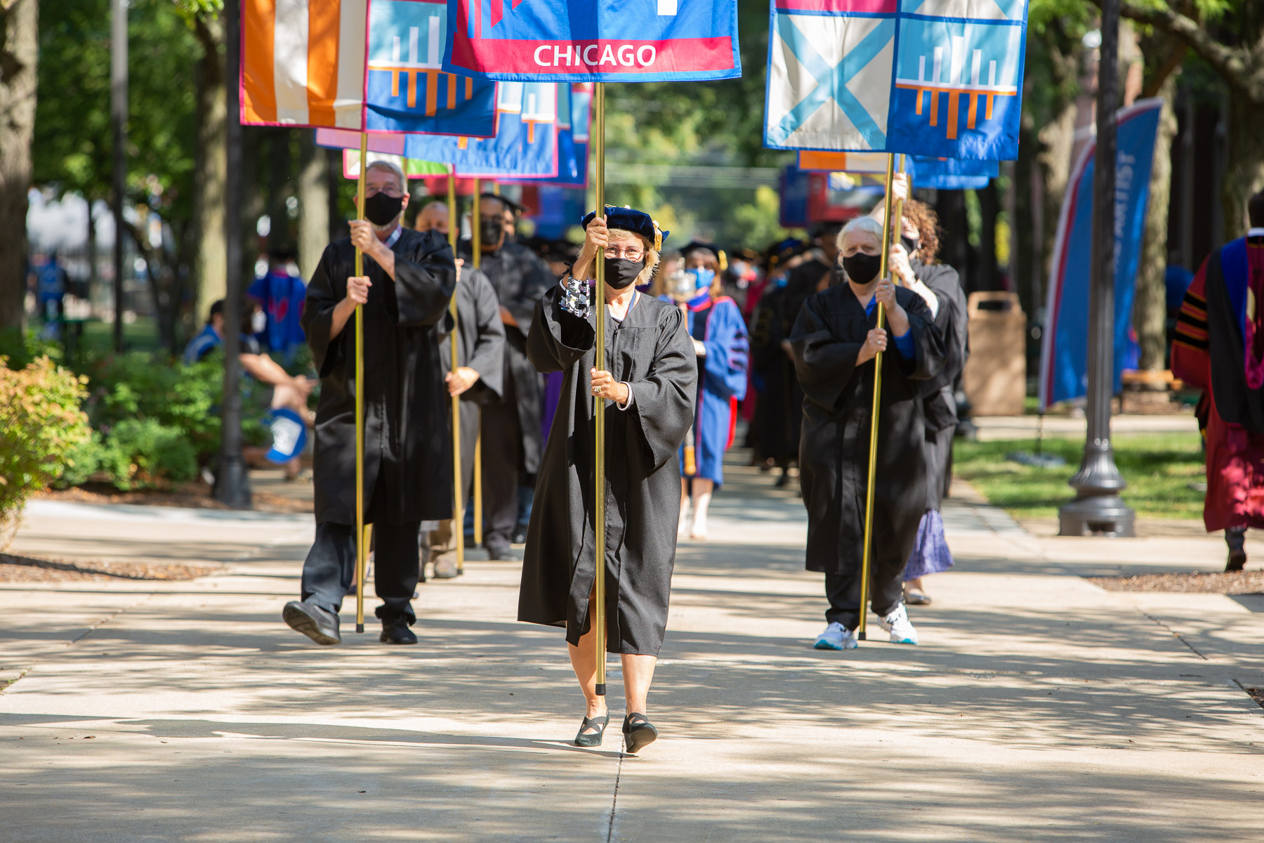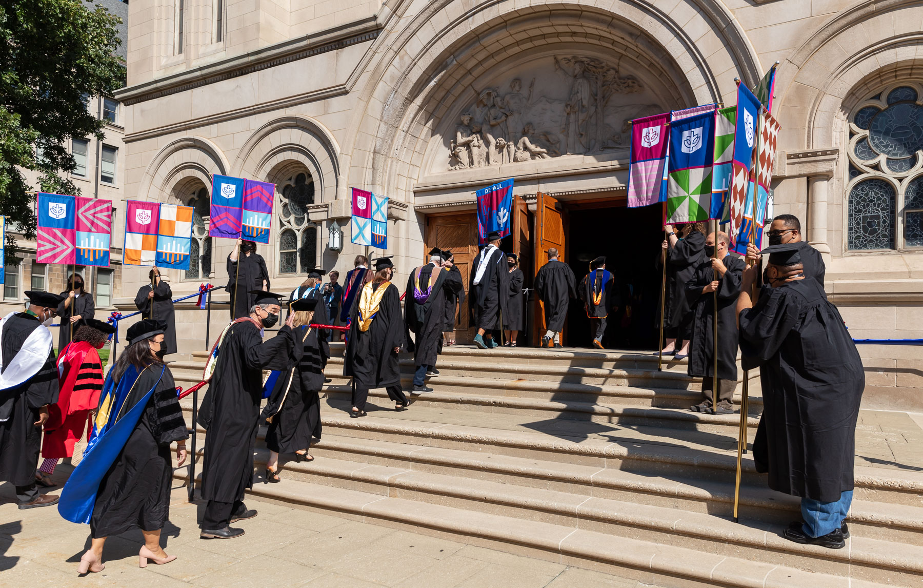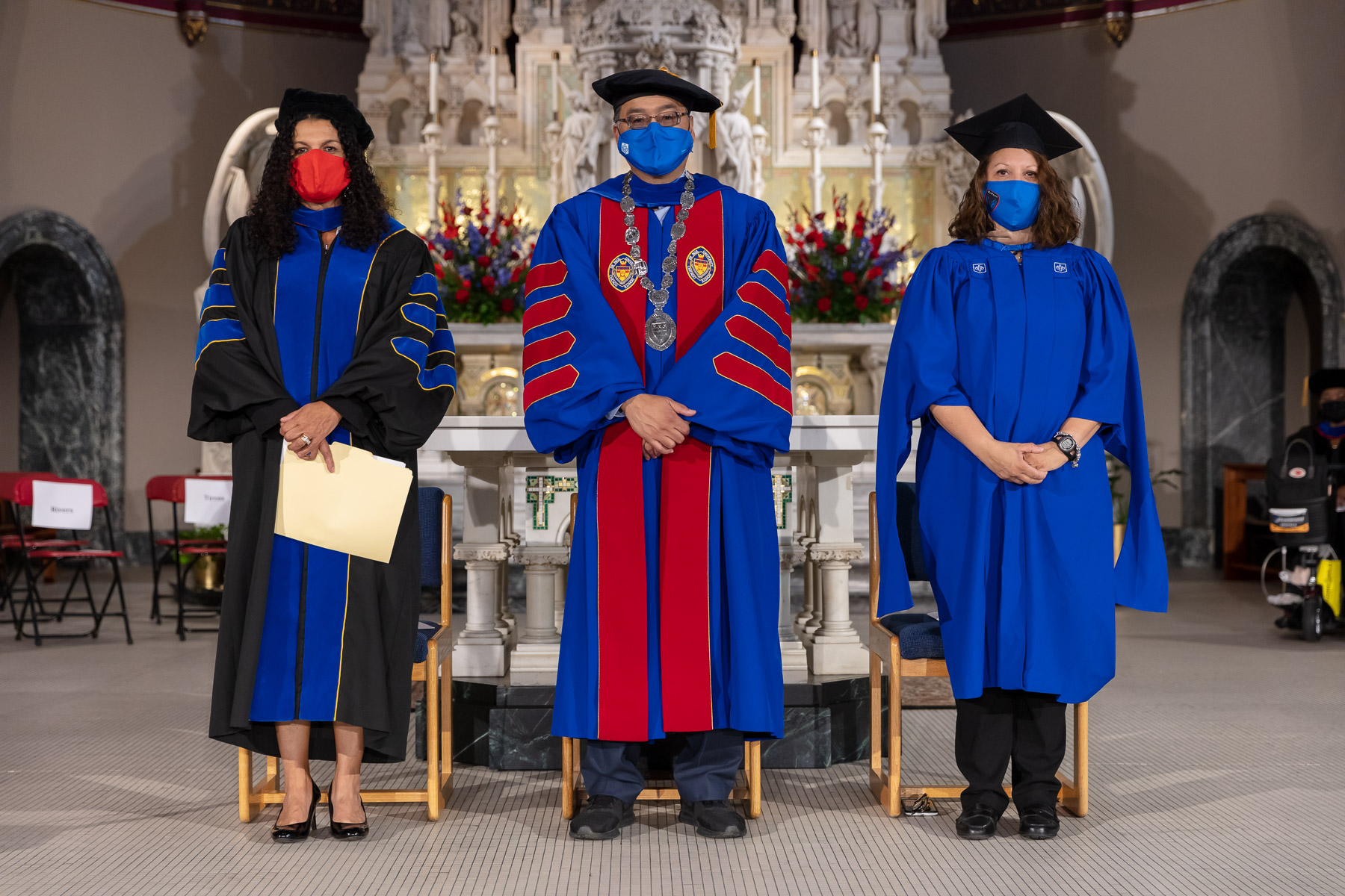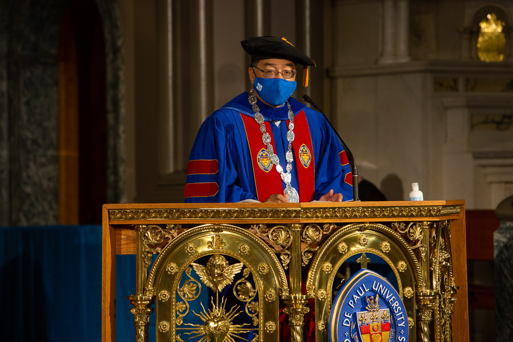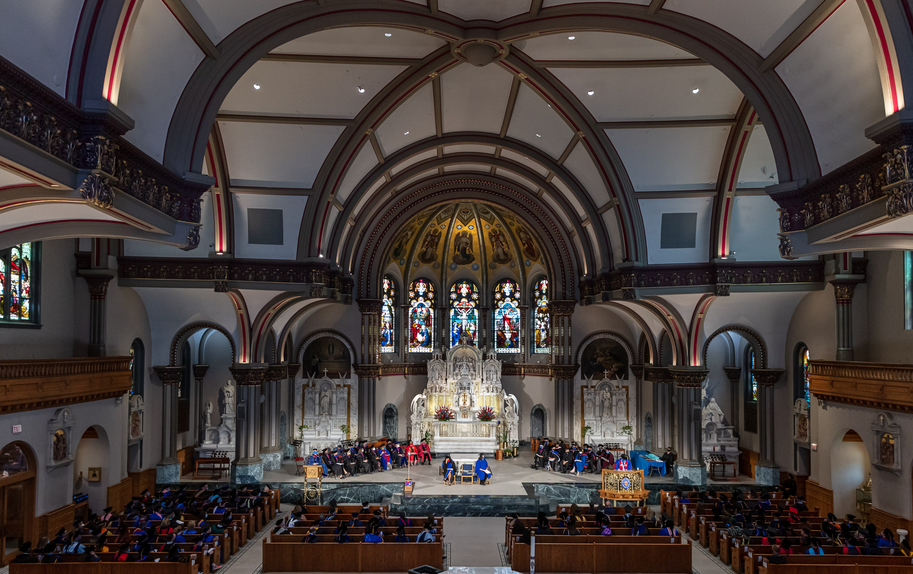 Faculty and staff gathered at St. Vincent de Paul Church for Academic Convocation on Sept. 3. The first in-person ceremony in almost two years began DePaul's 124th academic year. Provost Salma Ghanem and President A. Gabriel Esteban, Ph.D., spoke to the crowd and more than a dozen awards and recognition were presented.