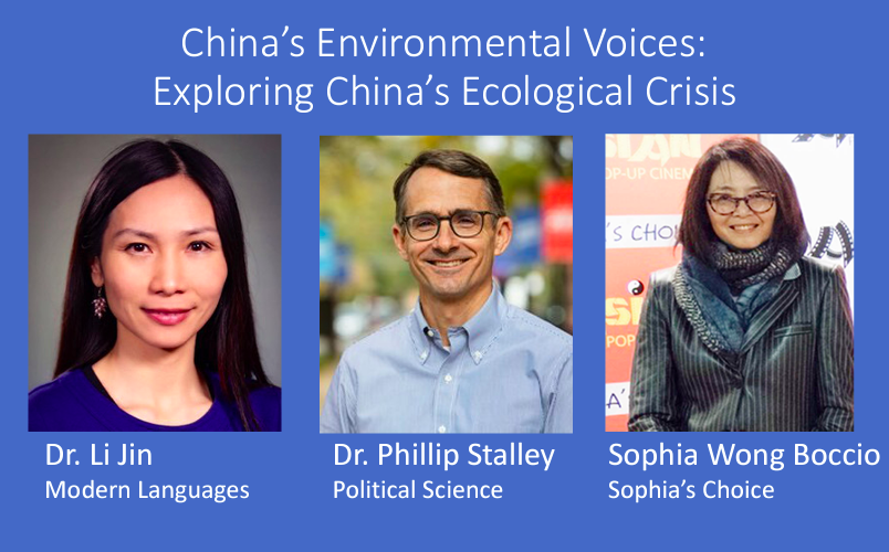 - Li Jin (Modern Languages, Global Asian Studies) , Phillip Stalley (Political Science), and Sophia Wong Boccio (Executive Director, Sophia’s Choice): developing the course, “China’s Environmental Voices: Exploring China’s Ecological Crisis”