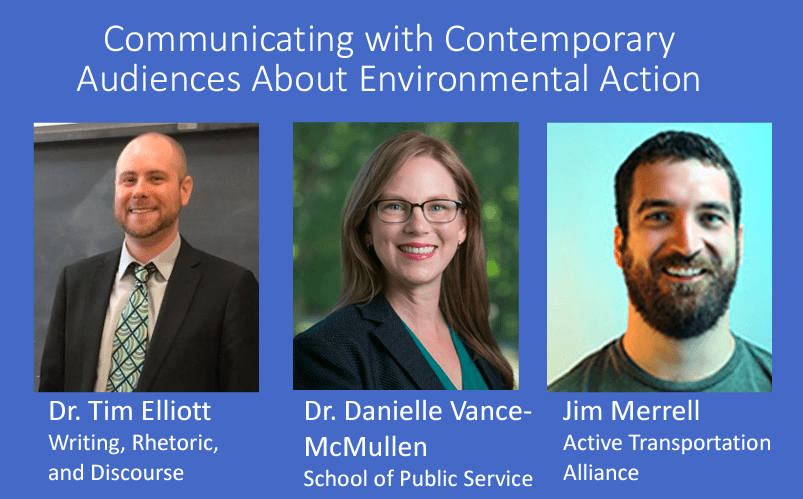 Our year-long fellowship supports three interdisciplinary teams as they collaboratively develop and deliver co-taught, project-based, community-engaged courses, to be offered in Spring 2023. The teams of new fellows and the courses they will develop—all focused on the theme of The Environment: Crisis and Action—are as follows:- Tim Elliott (Department of Writing, Rhetoric, and Discourse), Danielle Vance-McMullen (School of Public Service), and Jim Merrell (Managing Director of Advocacy, Active Transportation Alliance): developing the course, “Communicating with Contemporary Audiences About Environmental Action”