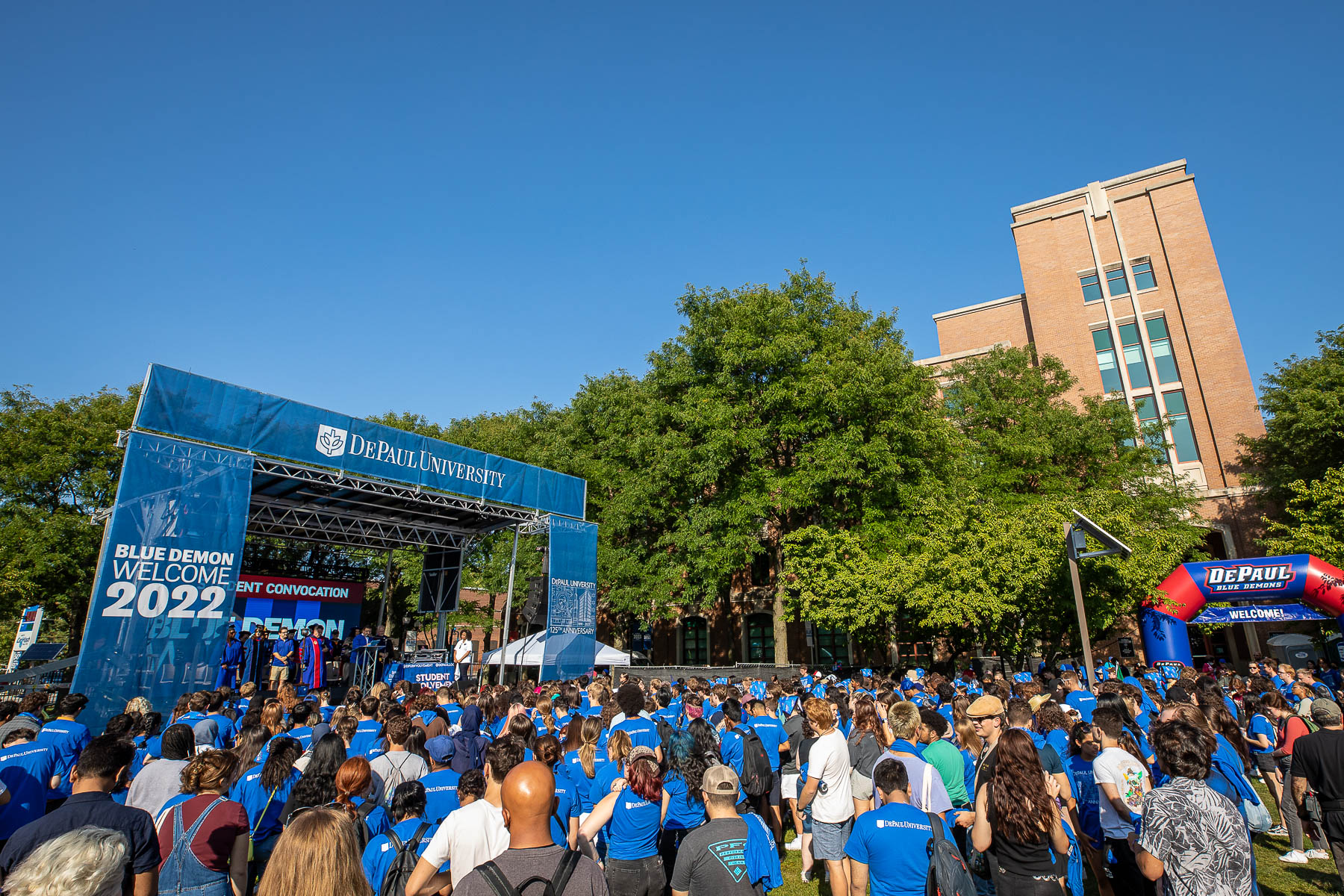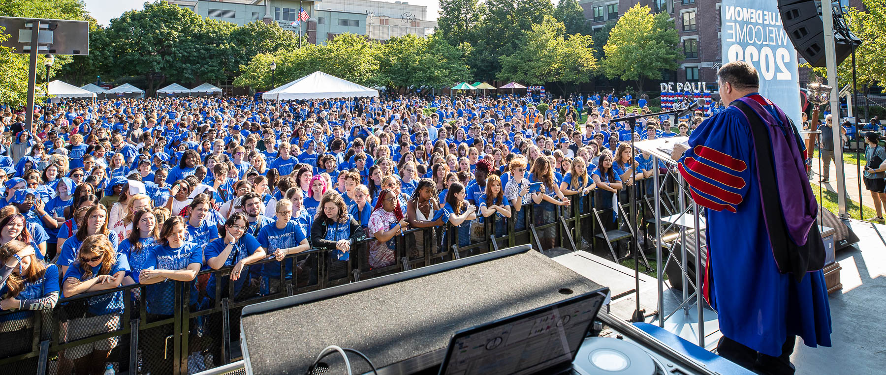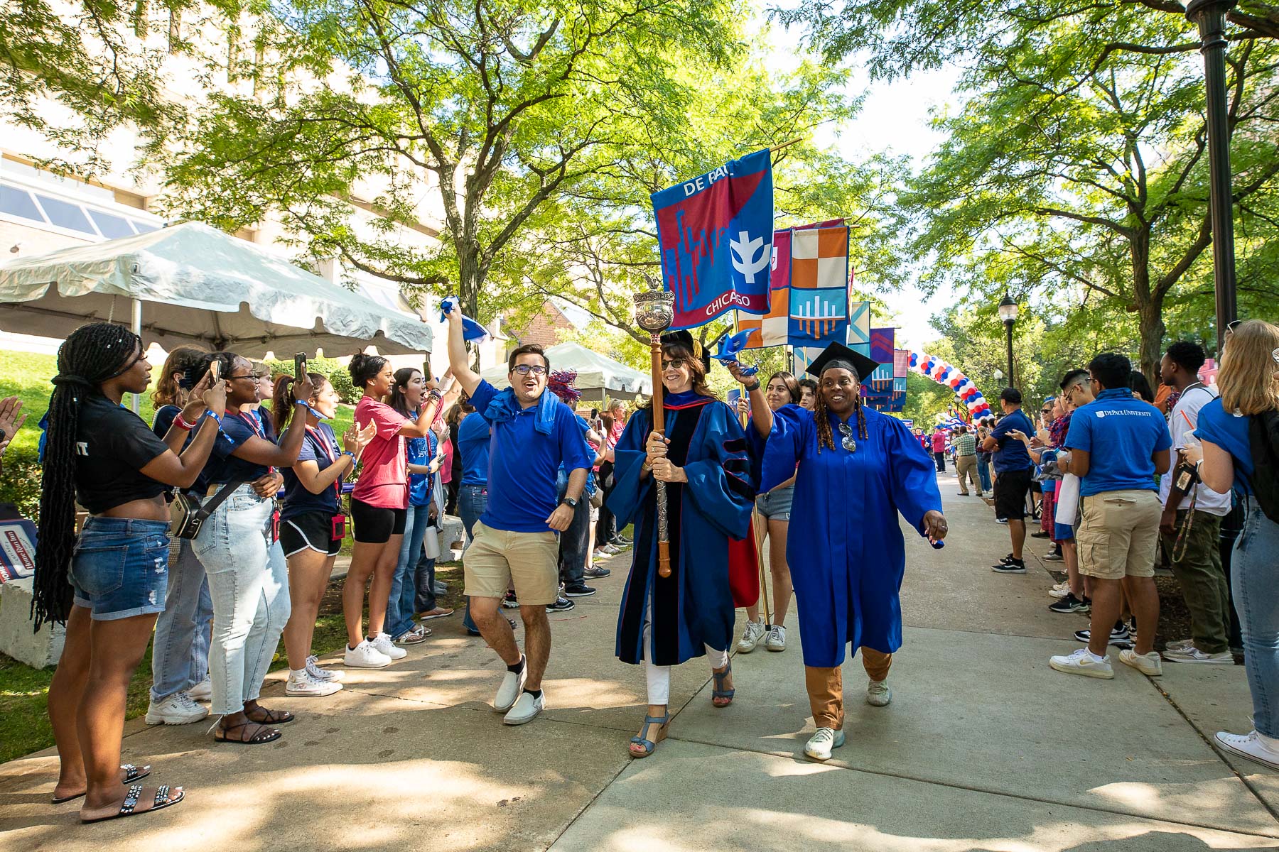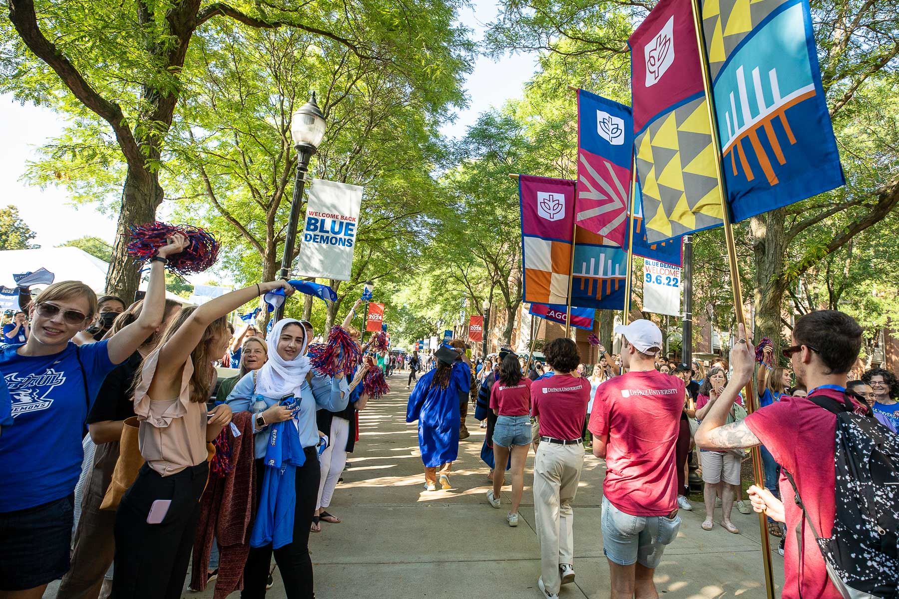 On Sept. 6, DePaul's new students were welcomed by faculty, staff and current students during this year's Blue Demon Welcome on the Lincoln Park Campus Quad. New students gathered in McGrath-Phillips Arena and processed in the New Student Cavalcade to the Quad where they were greeted by the campus community and other special guests.