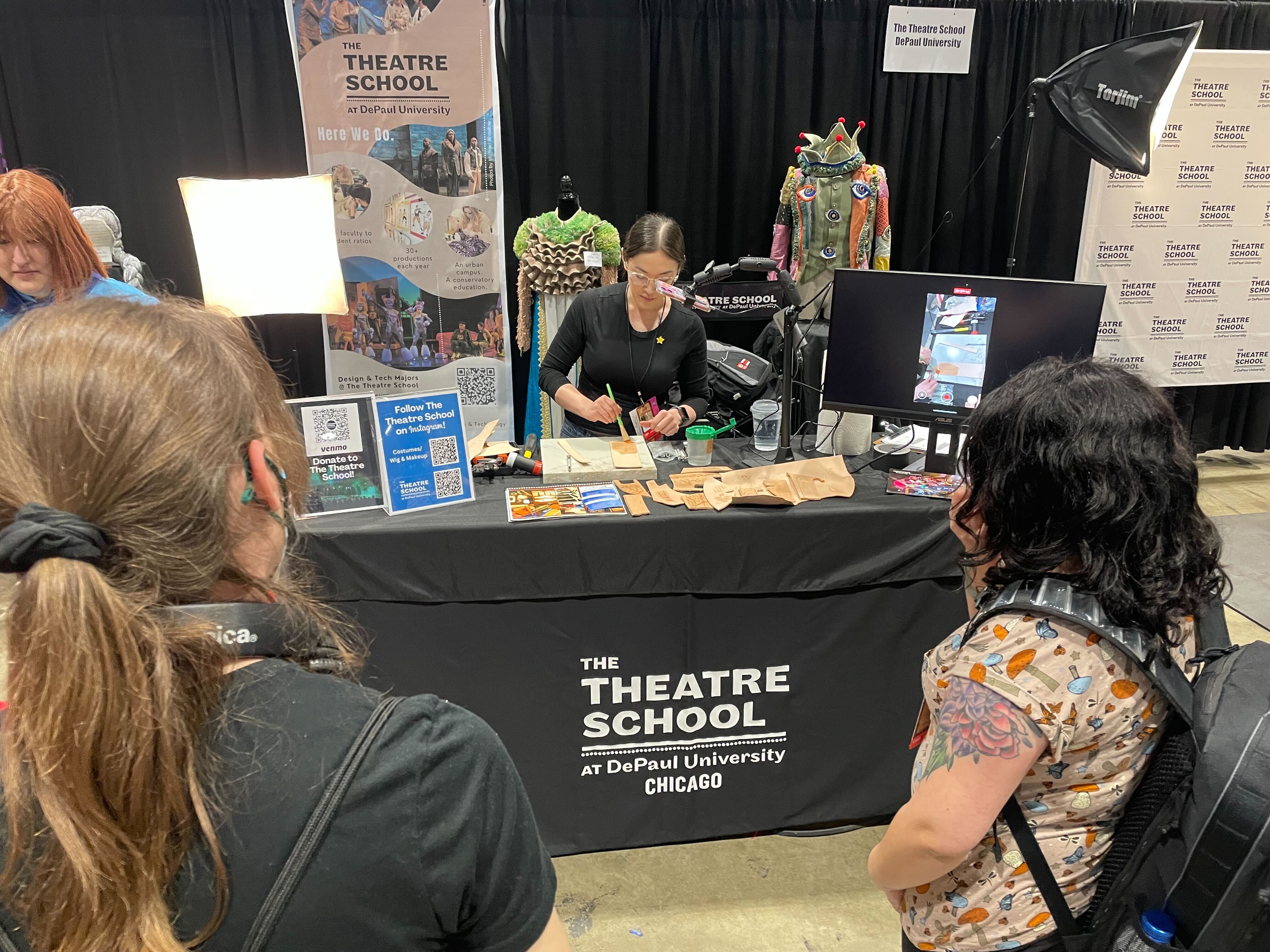 The Theatre School's booth offered cosplay repairs and demos to share students’ costume construction expertise. They also held makeup demos for people interested in special effects or cell shaded makeup.