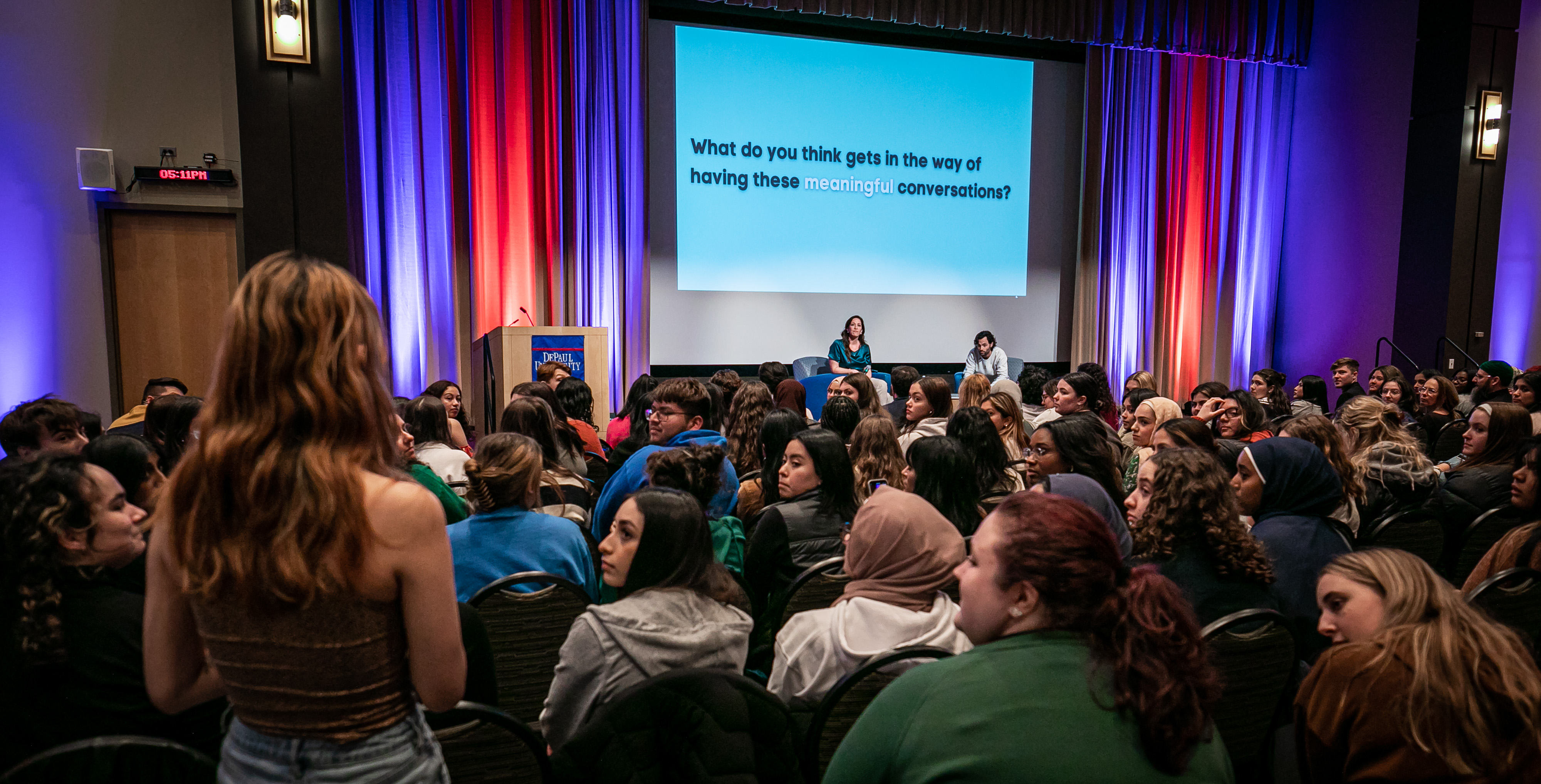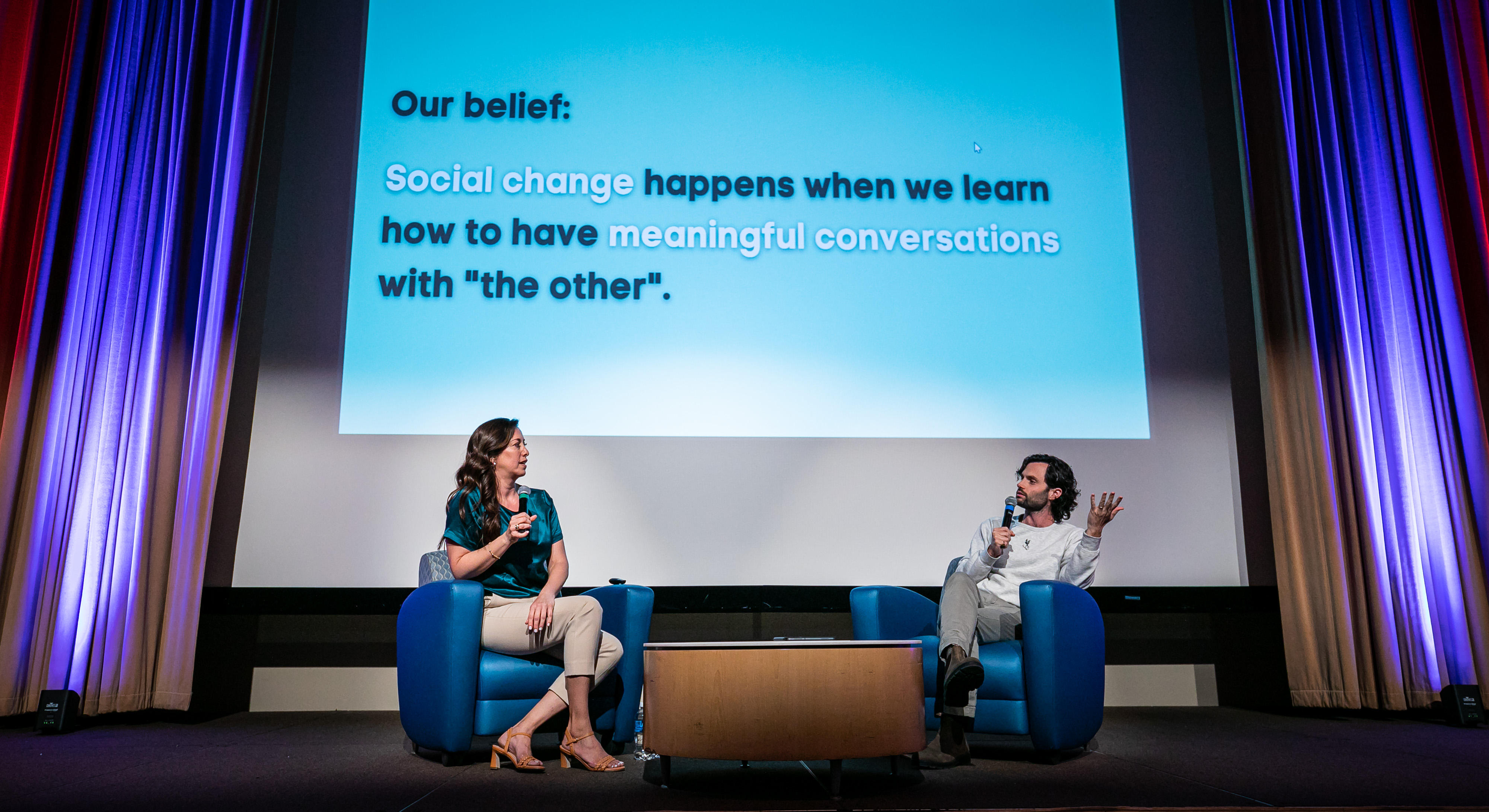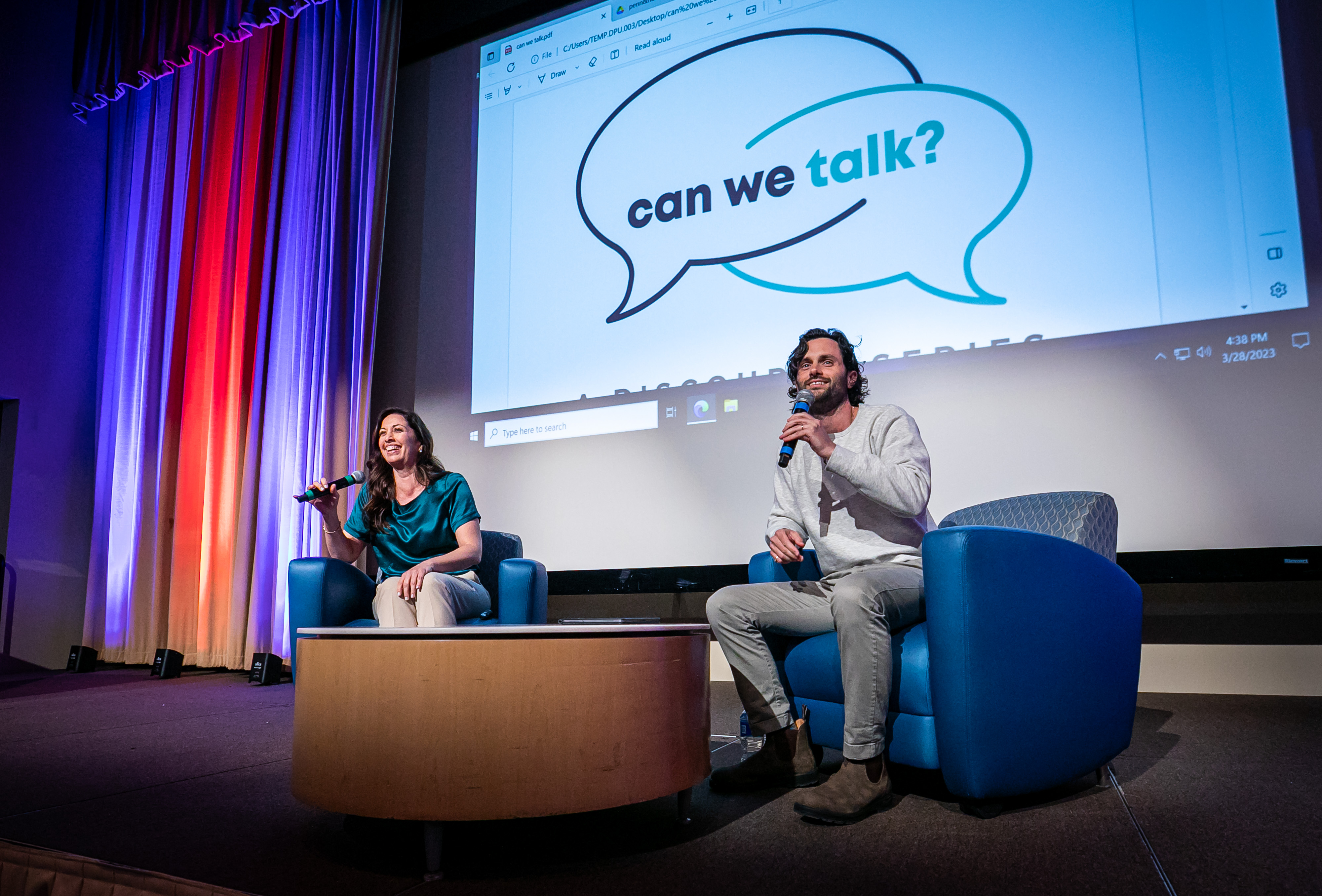 DePaul was star-struck when actor Penn Badgley, star of "Gossip Girl" and Netflix's "You," visited campus along with Nura Mowzoon, an instructor at Arizona State University, to present their discourse series "Can We Talk?," on March 28. The event at the Lincoln Park Student Center engaged students in a constructive dialogue that explored how to shift our style of discourse from one of contention to one of cohesion and collaboration.