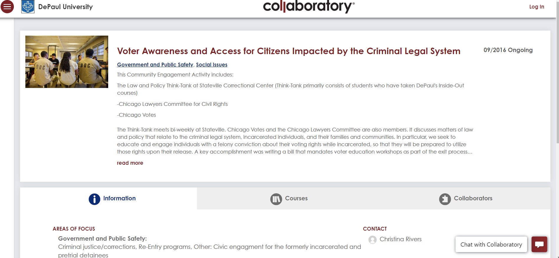 Christina Rivers, Associate Professor of Political Science, says that Collaboratory also could provide key information to external audiences, including journalists, who want more in-depth information than they are likely to find on department websites or other databases. “Collaboratory can be a much more thorough and interactive version of what an individual's website could be," she says. “It's also a good way to find out who you could possibly collaborate with at DePaul." Rivers teaches a course within DePaul's Inside-Out Prison Exchange Program, and also collaborates on a law and policy think tank initiative that meets bi-weekly at Stateville Correctional Center in Joliet, Illinois. In Collaboratory, “Voter Awareness and Access for Citizens Impacted by the Criminal Justice System" describes the initiative where students from campus (primarily those who have taken Inside-Out courses) and incarcerated individuals at Stateville meet to discuss matters of law and policy that relate to the criminal justice system. Community organizations such as Chicago Lawyers Committee for Civil Rights and Chicago Votes also participate.