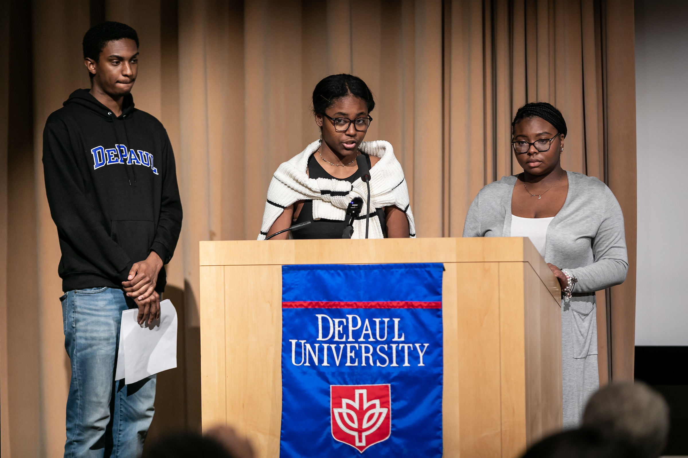 DePaul students Jaslynn Hodges, Vick-Ariel Privert and Jaylen Grigsby addressed those gathered. “Non-white people must reckon with un-comfortability and lean into social justice conversations. But we as Black people must remember that it is not our sole job to educate others on the injustice as they have caused us,” Privert said. “We must support uplift and care for each other to ensure that our history and greatness does not die with our ancestors that gave their lives fighting for the opportunity to tell their stories.”