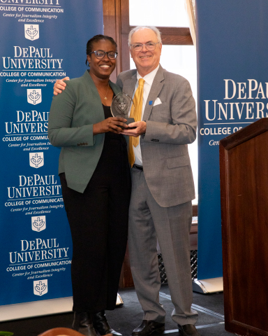 The Center for Journalism Integrity & Excellence held their annual award ceremony and luncheon at the Union League Club on April 25, 2024. Center co-directors Carol Marin and Don Moseley presented ABC News journalist John Quiñones with the 2024 Distinguished Journalist Award, Block Club Chicago reporter Rachel Hinton with the 2024 Distinguished Alumna Award, and alum Marty Wilke with the 2024 Distinguished Mentor Award.