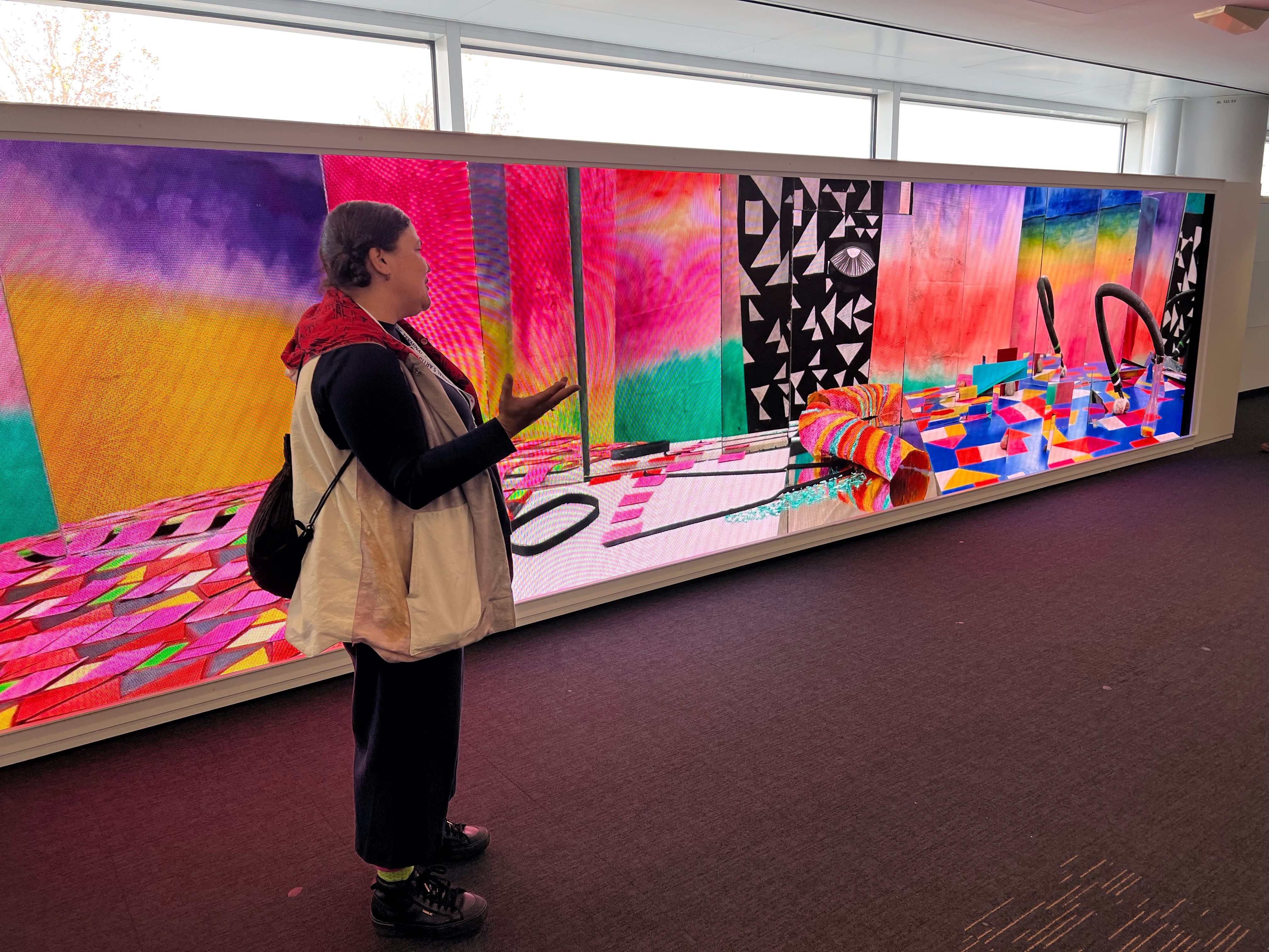 Trepp adapted to the space by creating an animation that moved along with the travelers towards their destination. “The unconventional space the work is installed in did affect my thinking about how the viewership would interact with it,” Trepp says. “If someone in the corridor experiences at least one or two of my characters walking with them, there is the possibility of a full experience even in this brief interaction.”