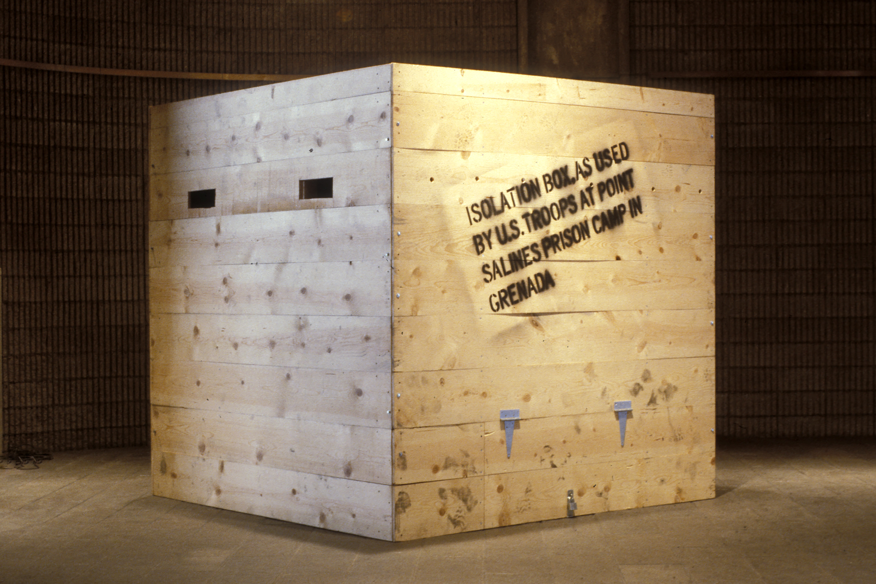 - The reconstruction of Hans Haacke’s original installation “U.S. Isolation Box, Grenada, 1983.” The artwork recreates the boxlike isolation chambers that American troops used to detain prisoners at the Point Salines Airport following the U.S. invasion of Grenada.