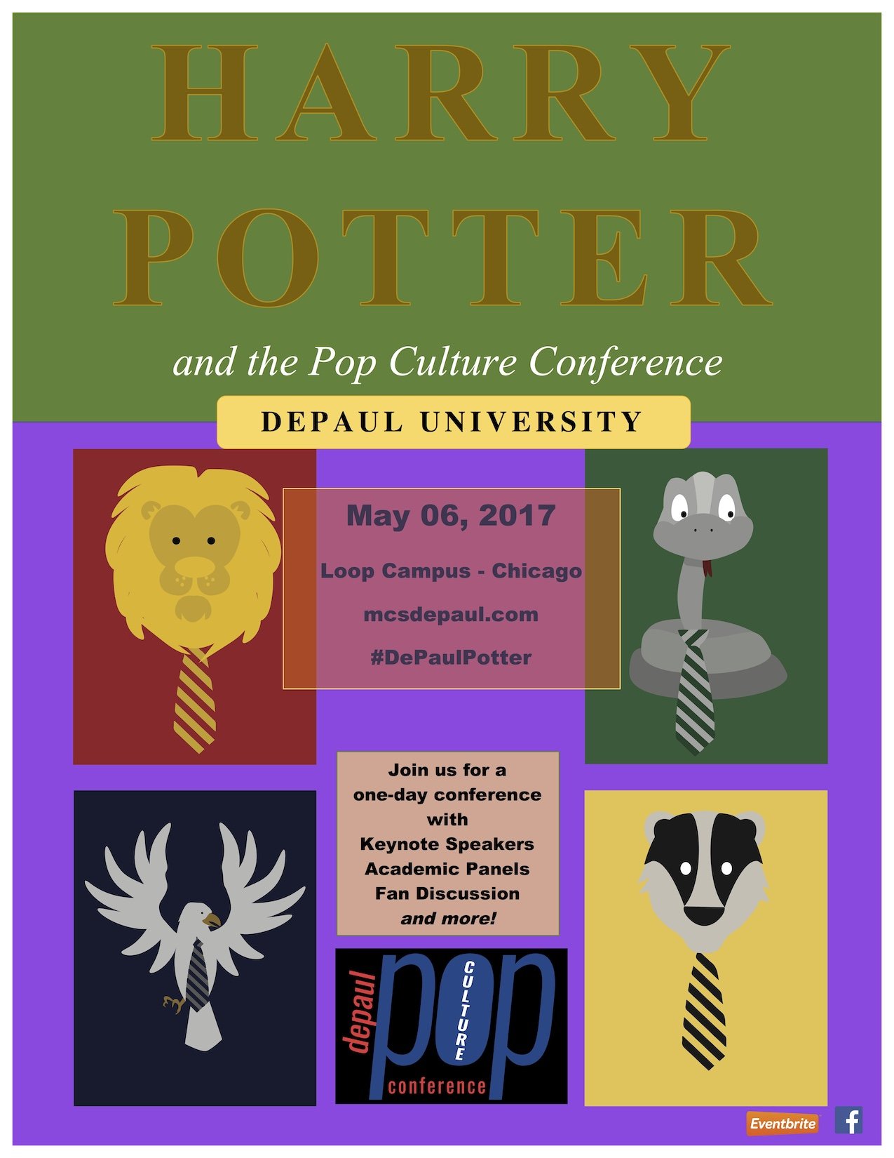 In honor of the 20th anniversary of the publication of Harry Potter and the Philosopher's Stone, DePaul Pop Culture held the 2017 Conference on Harry Potter on May 6, 2017. The conference featured panels of fans and scholars, keynote talks, games, festivities, and more.