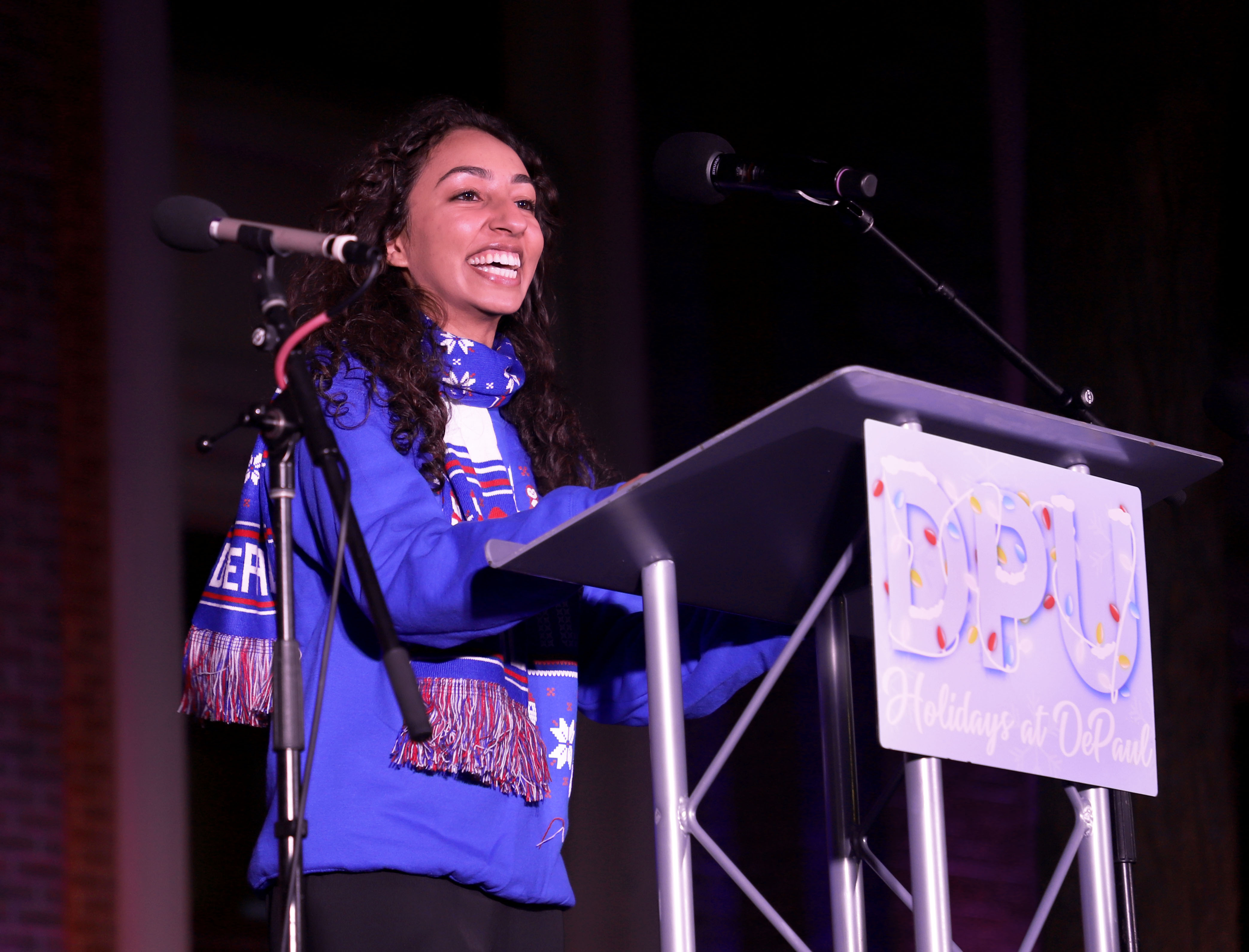 SGA president Isabella Ali speaks before the tree is lit. (Keeton Holder/DePaul University)