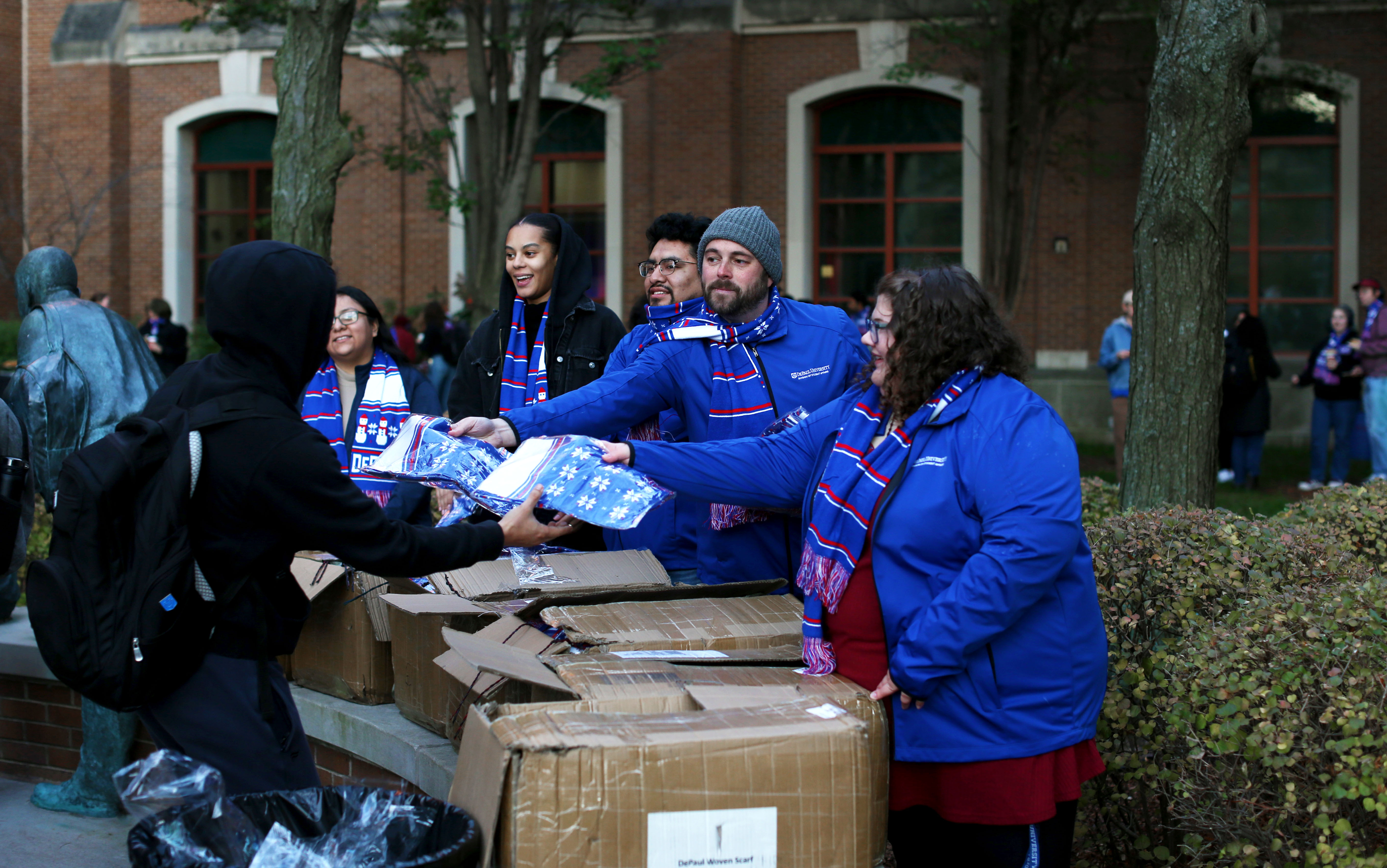 Workers hand out DePaul-branded scarves and mittens at the Tree Lighting Ceremony. (Kit Wiberg/DePaul Student Photo Agency)