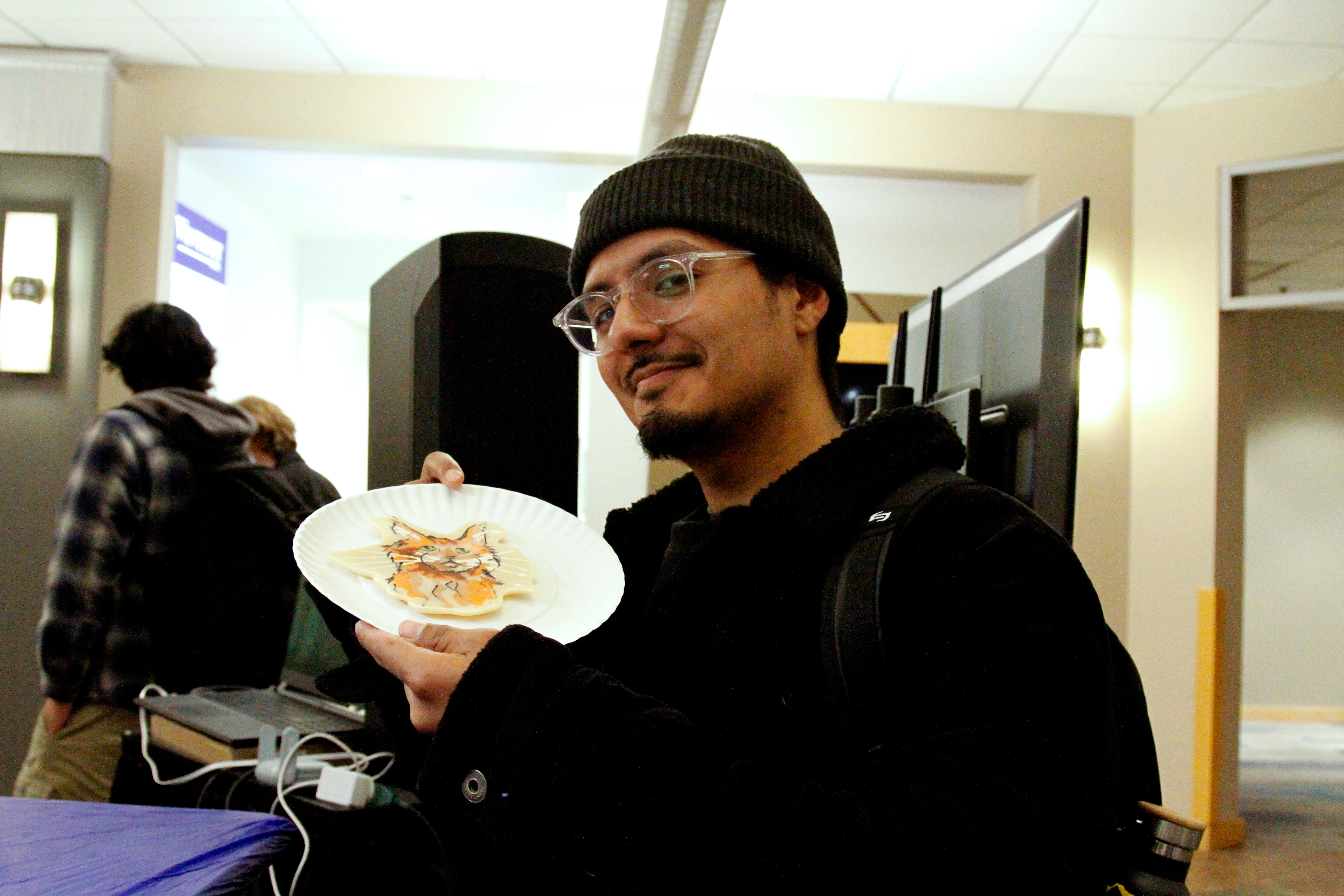 A student poses with his pancake, made to look like a cat. (Aubreonna Chamberlain/DePaul University)