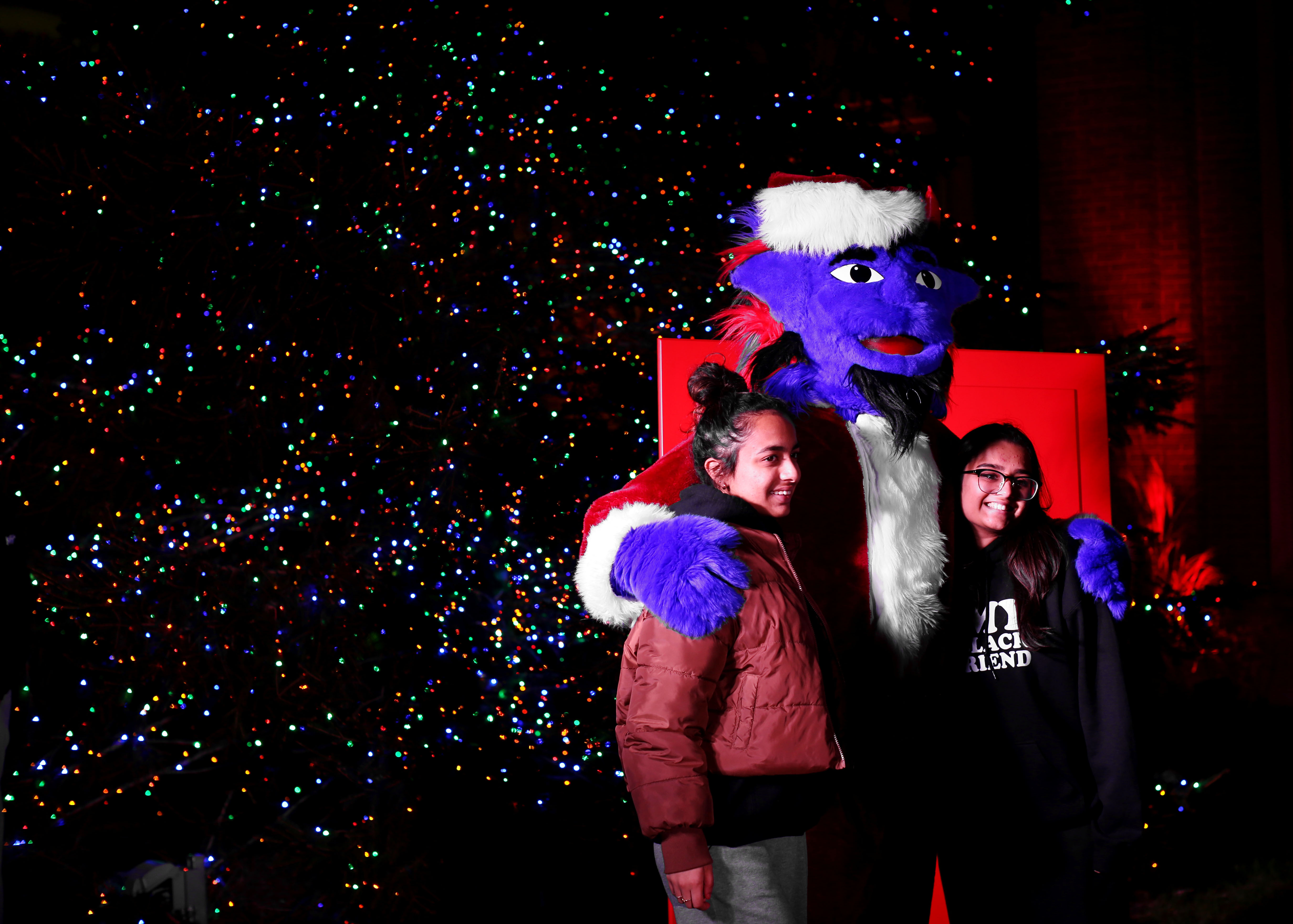 DIBS takes a photo with students in front of the freshly-lit DePaul Christmas tree. (Kit Wiberg/DePaul Student Photo Agency)