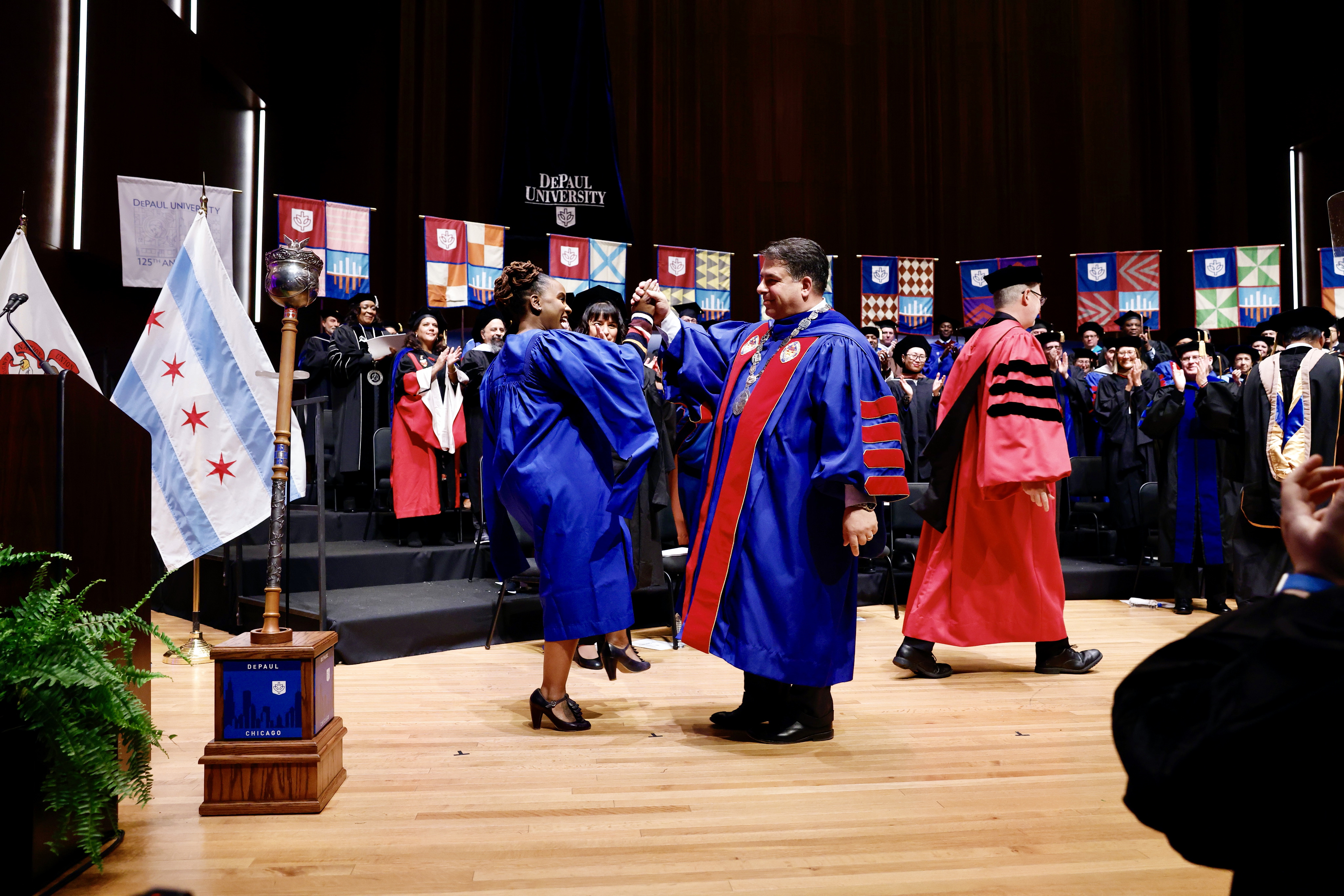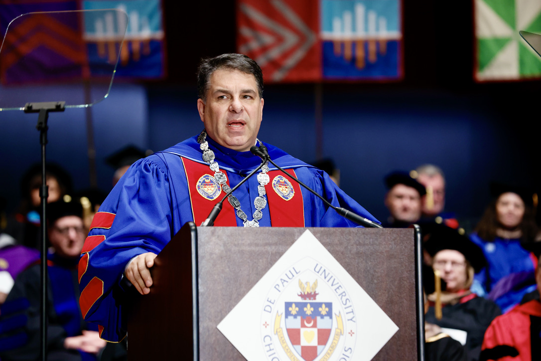 During his first 100 days at DePaul, Manuel set immediate priorities and called on faculty, staff and students to transform the university into a radically welcoming space. The themes of radical hospitality and service, derived from the theology of St. Vincent de Paul, were central to the ceremony. Manuel has built momentum around initiatives in diversity, equity and inclusion and academic excellence.
