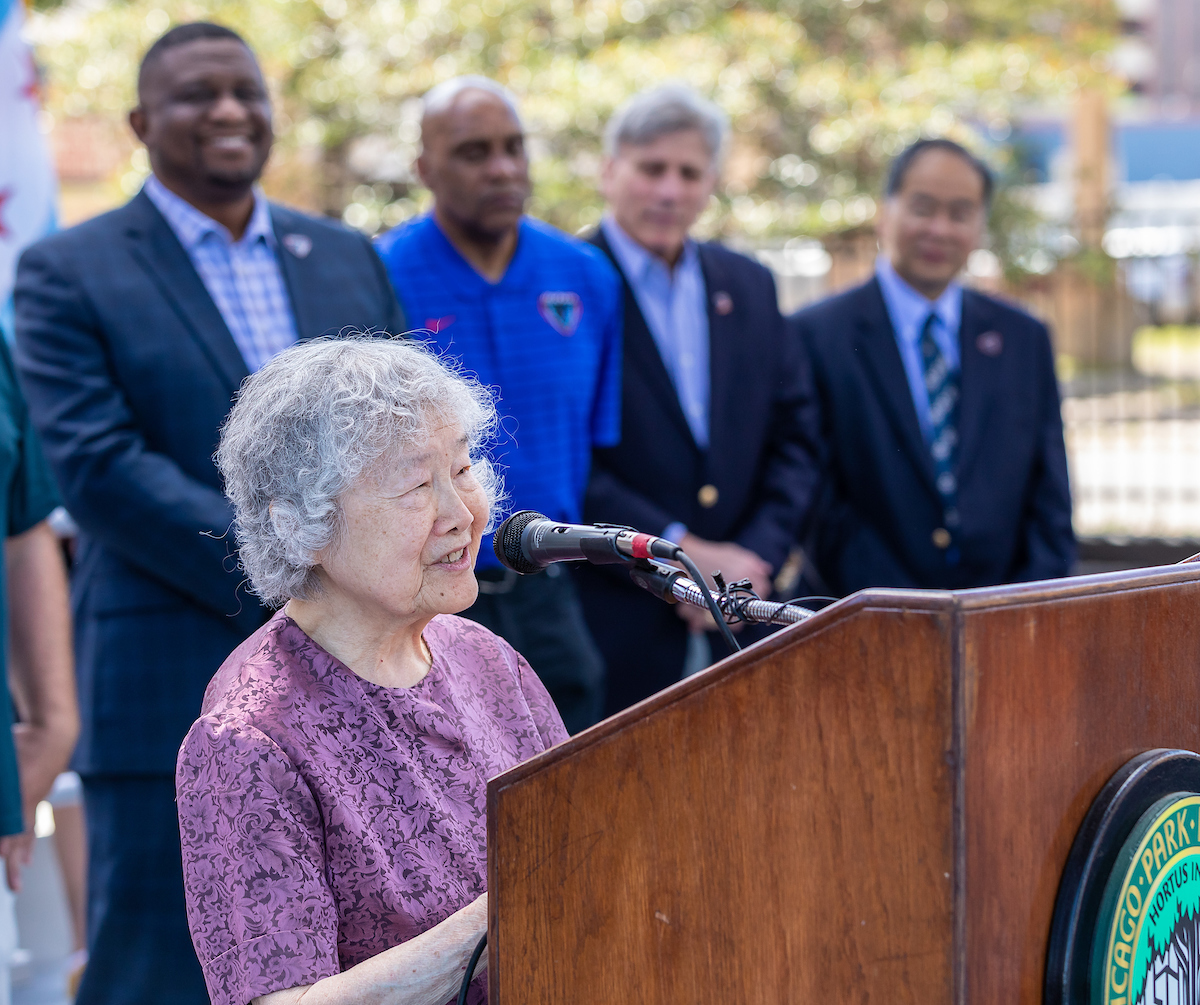 The park first opened in 1970 and is named for Dr. Margaret Hie Ding Lin, a physician who worked in the nearby Chinatown neighborhood. In his remarks, DePaul President A. Gabriel Esteban, acknowledged the park’s namesake.