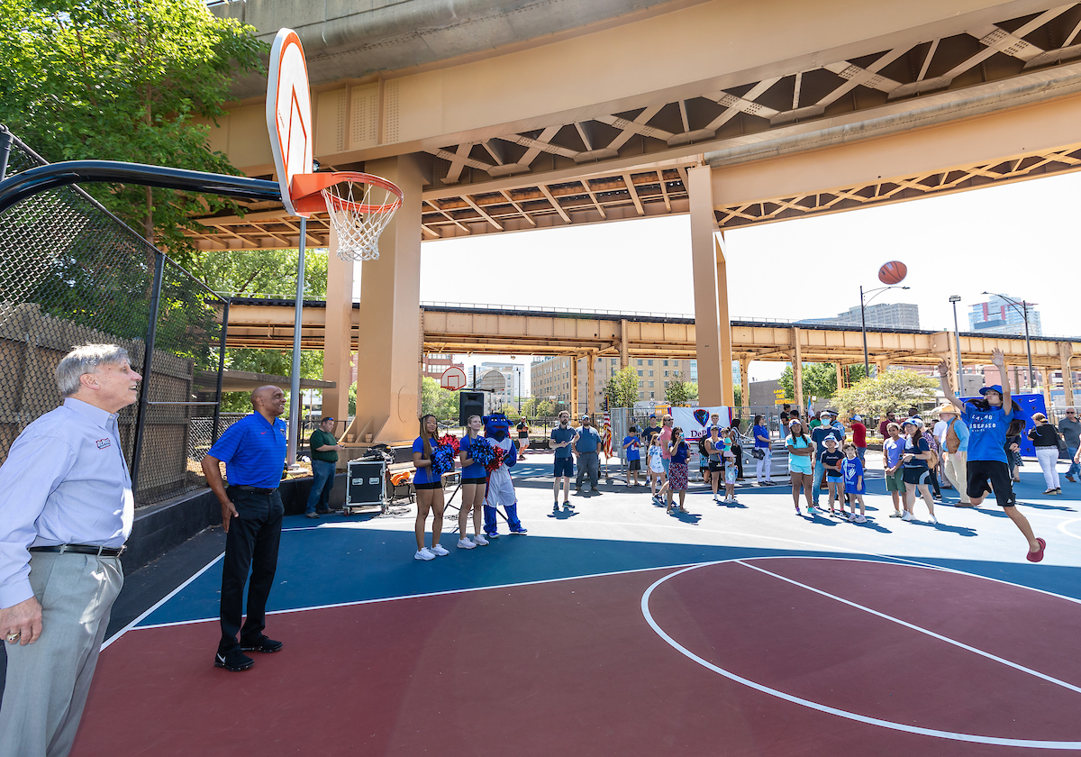 Children from the local community helped officials cut the ribbon. Then they took to the courts, playing as DePaul coaches Doug Bruno and Tony Stubblefield rebounded and DIBS and members of the spirit squad cheered them on. DePaul plans to provide ongoing stewardship of the park, with potential Athletics programming for youth, community events and clean-up during Vincentian Service Day.