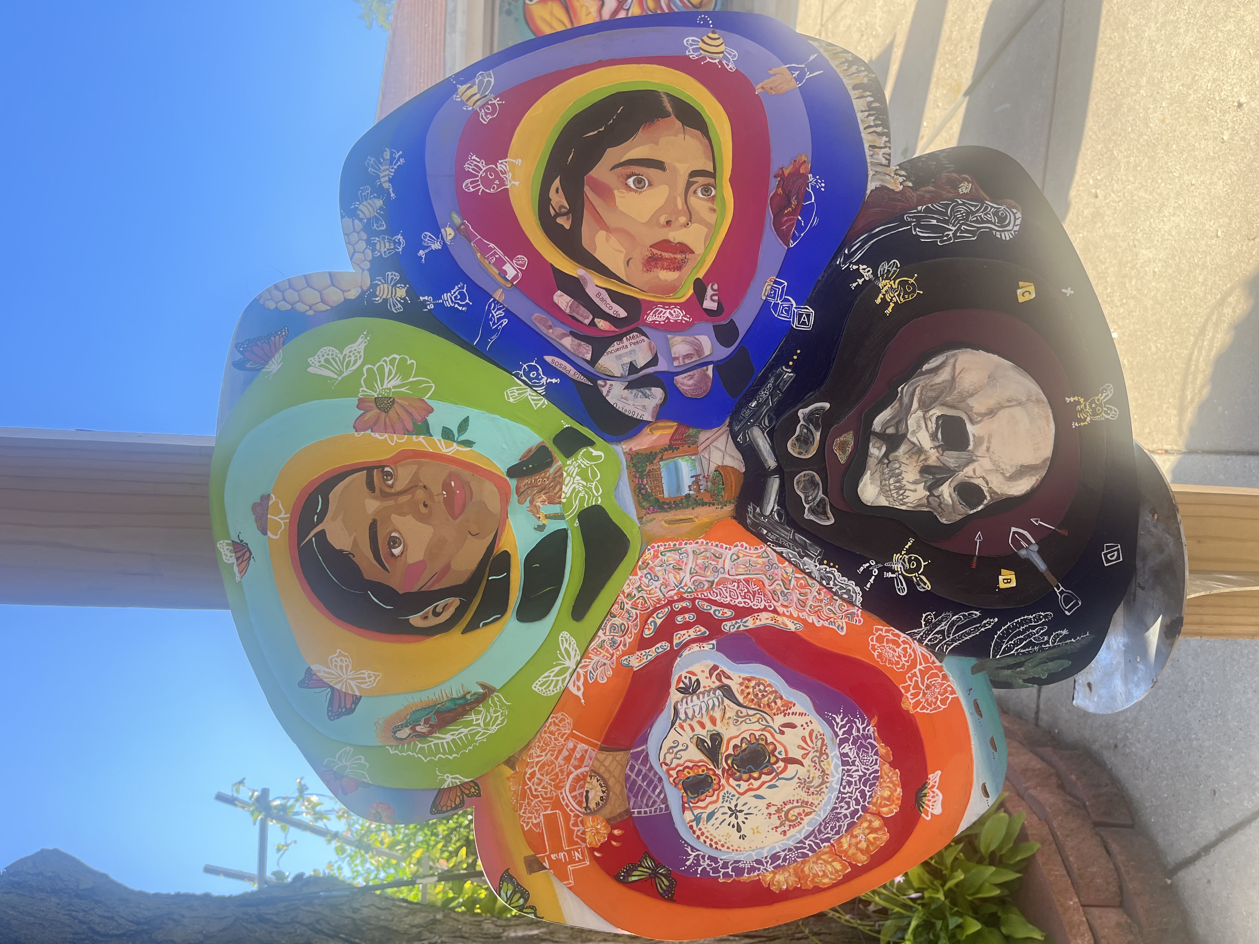 The sisters’ collaborative flower painting features a woman in each of the four petals. Lupe’s petals show the life of a woman surrounded by symbols of strength and power, enduring the hardships of women around the world face such as violence or lack of financial independence. Angela’s petals bring attention to how many women are in violent situations or have died. Finally, the final petal brings closure.