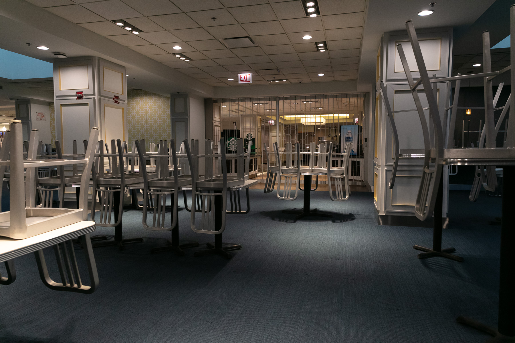 Chairs are neatly stacked table by table in an empty Market Café. (DePaul University/Randall Spriggs)
