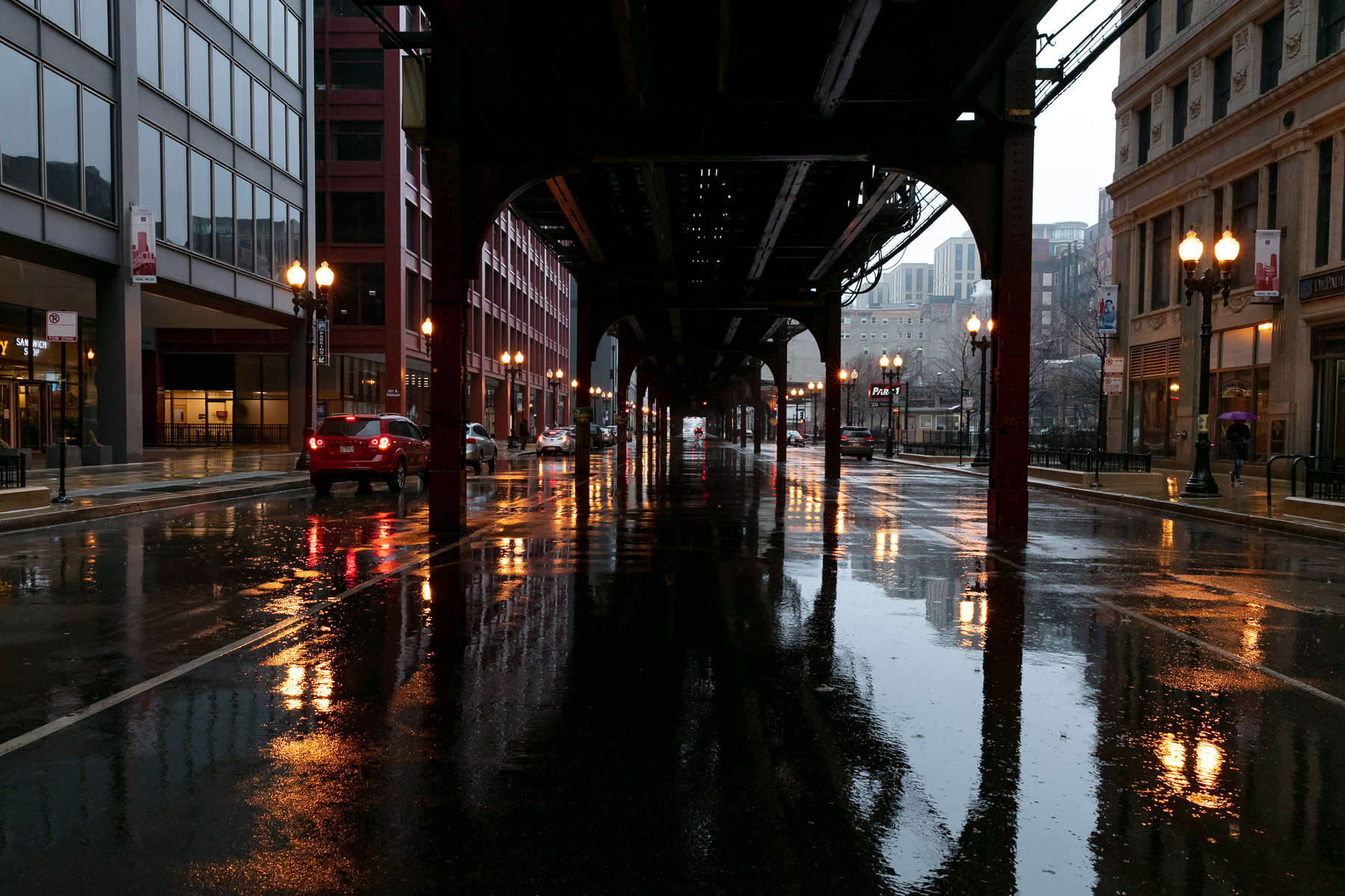 Wabash Avenue, usually busy during the height of evening rush hour, remains quiet as many citizens stay home during the COVID-19 pandemic. (DePaul University/Randall Spriggs)