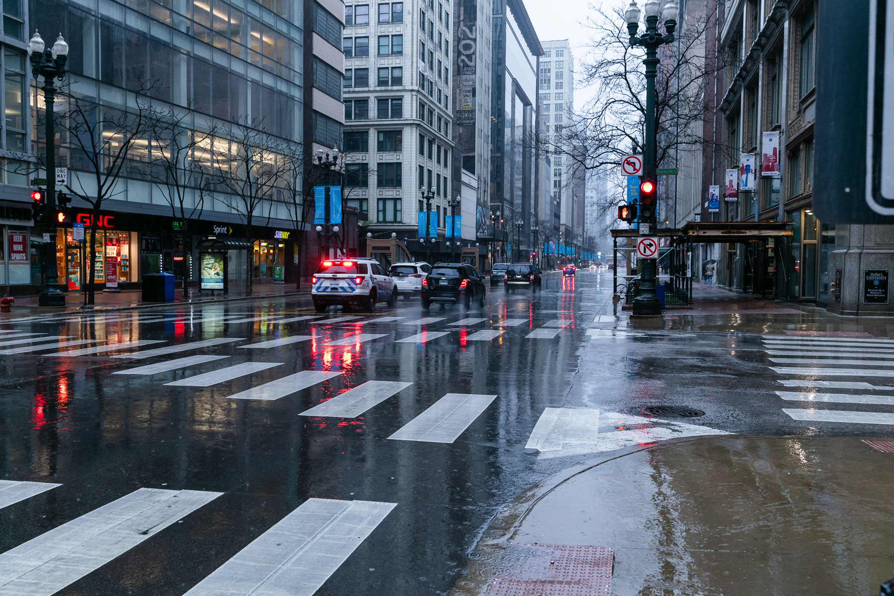 Streets and sidewalks remain virtually clear near State St. and Jackson Blvd., as the state's stay-at-home order is in place. (DePaul University/Randall Spriggs)