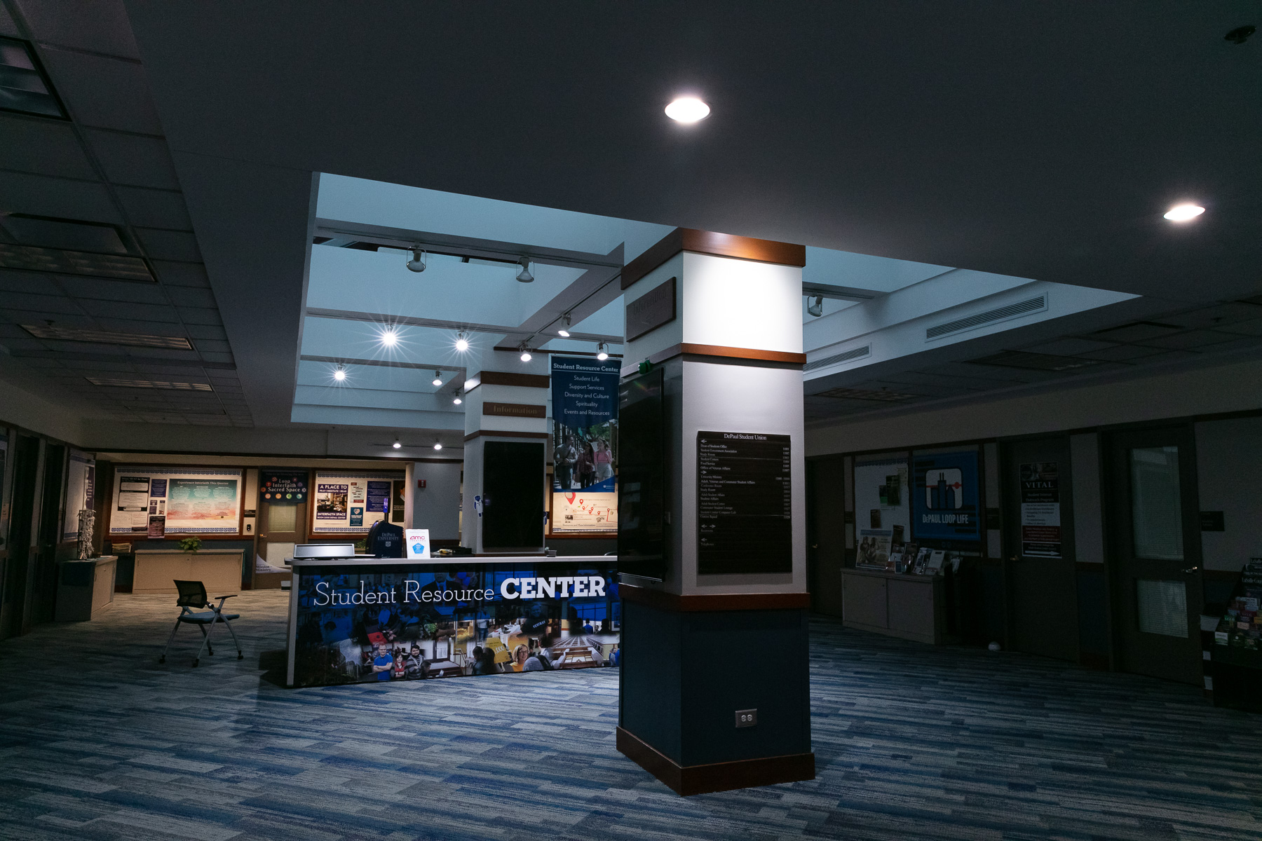 A solitary chair remains in the distance of the Student Resource Center. (DePaul University/Randall Spriggs)