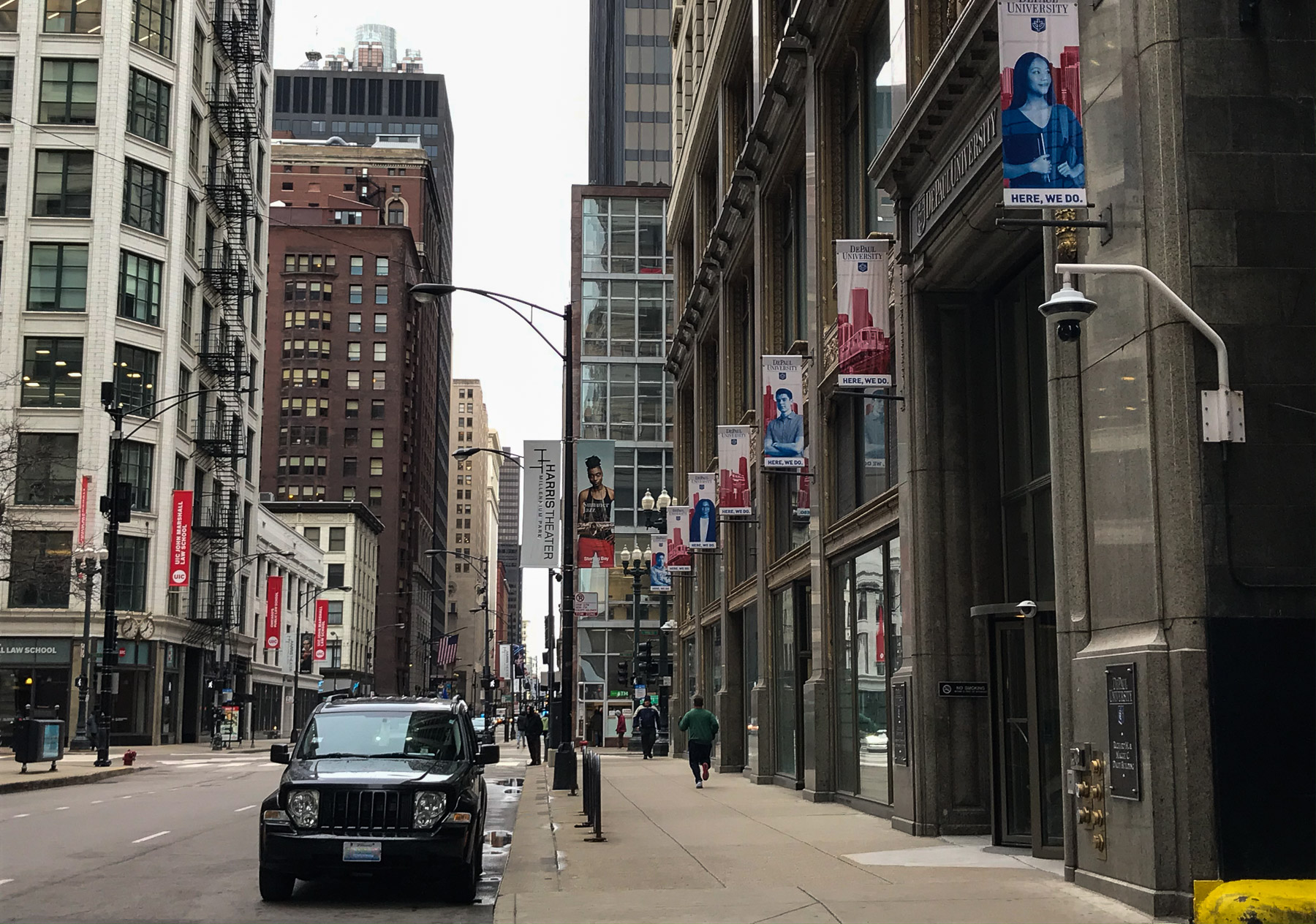 With quiet streets and a dry Chicago afternoon, joggers were able to get a daily run on the sidewalks of Jackson Blvd. (DePaul University/Randall Spriggs)