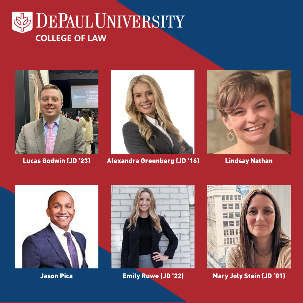DePaul Law’s Schiller DuCanto & Fleck Family Law Center welcomes our new Advisory Board members: Lucas Godwin (JD ’23), Life Span; Alexandra Greenberg (JD ’16), Davis Friedman; Lindsay Nathan, Ascend Justice; Jason Pica, Dussias Wittenberg Koenigsberger LLP; Emily Ruwe (JD ’22), The Law Office of Erin M. Wilson, LLC; and Mary Joly Stein (JD ’01), Cook County State’s Attorney’s Office!