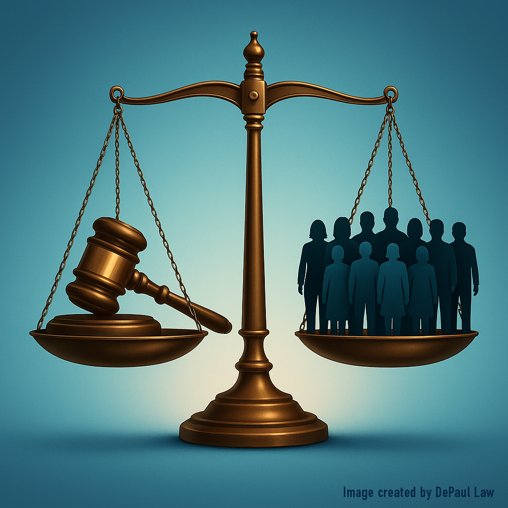 DePaul Law faculty also play a central role in shaping the program’s impact. Full-time faculty experts, including Sioban Albiol, Jesse Cheng, David Franklin, Julie Gilgoff, Elisabeth Ward and Mark Weber, cover areas such as immigration, criminal law, constitutional law, housing and homelessness policy, human rights, and disability and special education. They are complemented by public interest law professionals who serve as adjunct professors, including Caroline Chapman (Poverty Law), and Kevin Curran (Legal Writing), Kelli Dudley (Housing Law), Rachel Koch (Education Law & Policy), Noah Praetz (Election Law) and Elizabeth J. Vastine (Restorative Justice). Together, this blend of academic expertise and practical experience helps students see how legal, social and historical forces intersect with the realities of public interest practice.