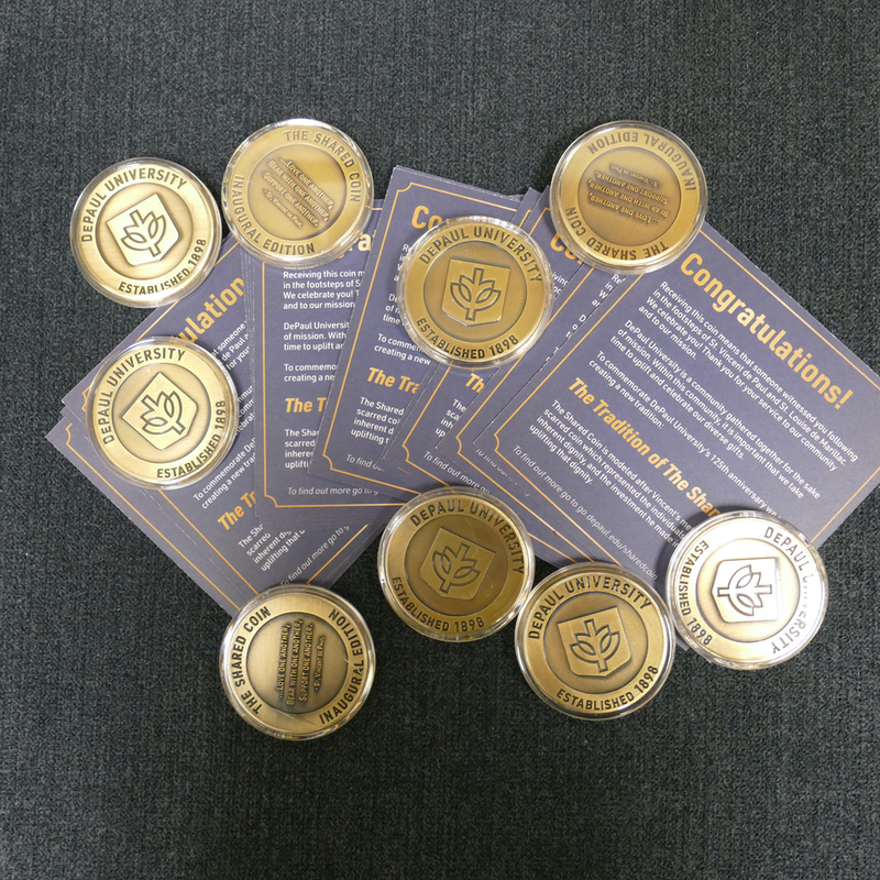 In celebration of DePaul University's 125th anniversary, the Division of Mission and Ministry started a practice called The Shared Coin on Foundation Day, Jan. 25. This provides DePaul students, faculty, and staff with an opportunity to recognize, by sharing a coin, individuals who are living out the university's Vincentian mission.