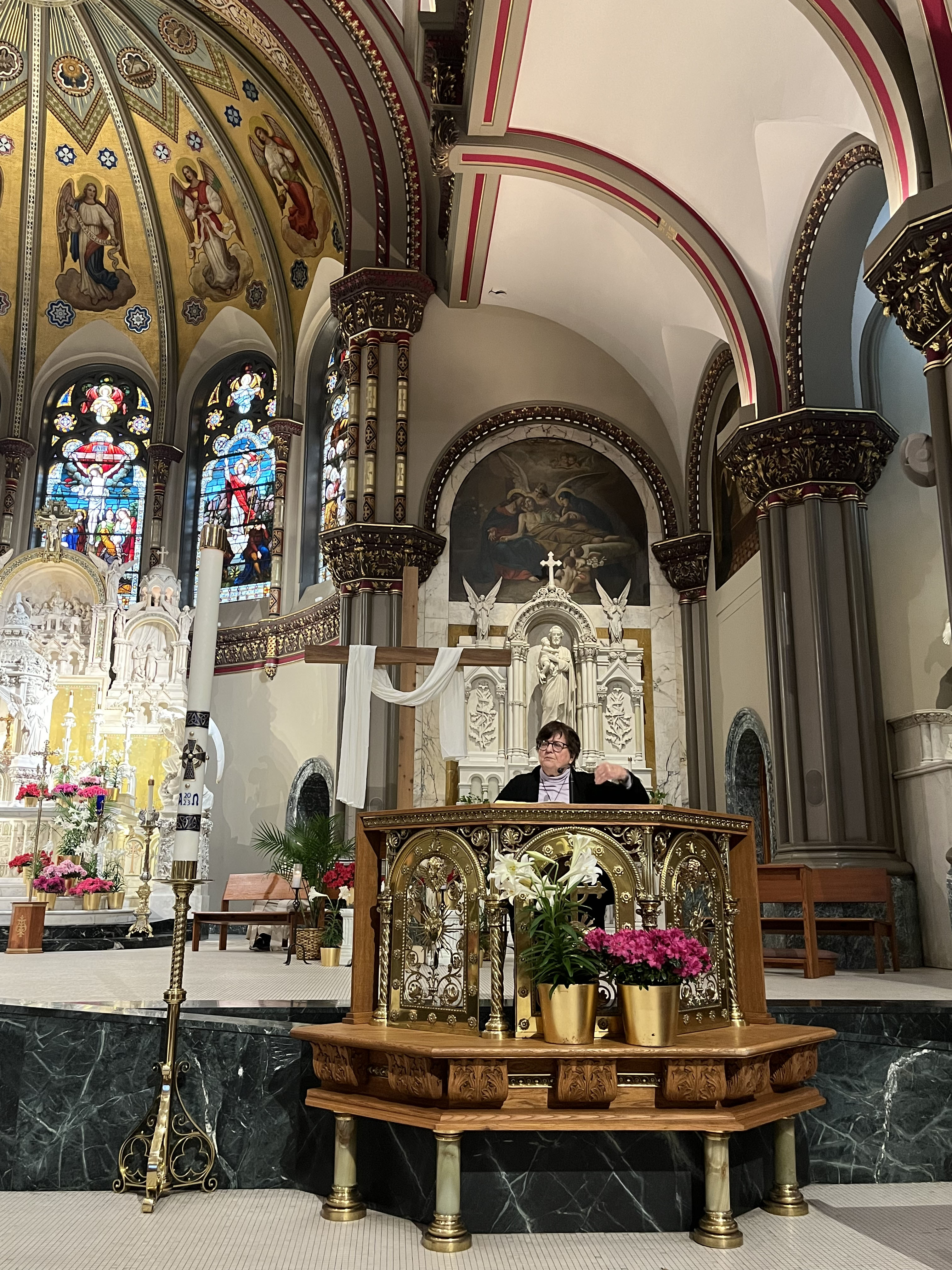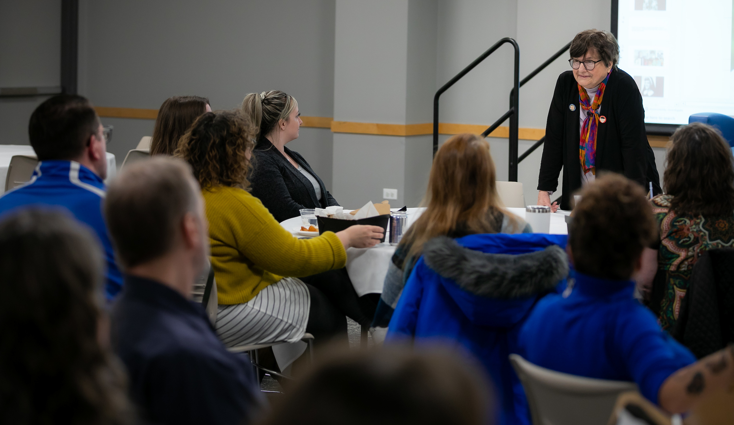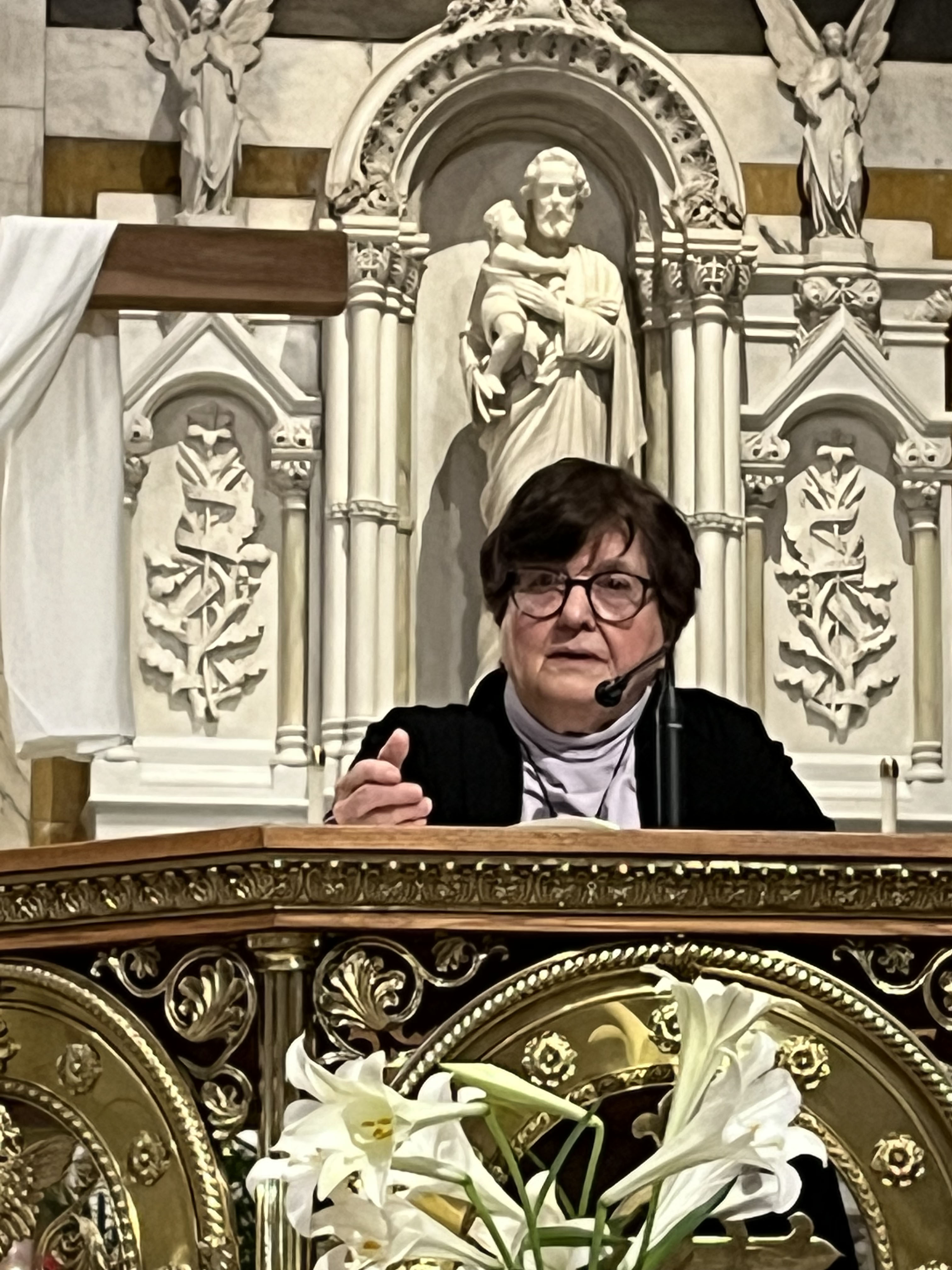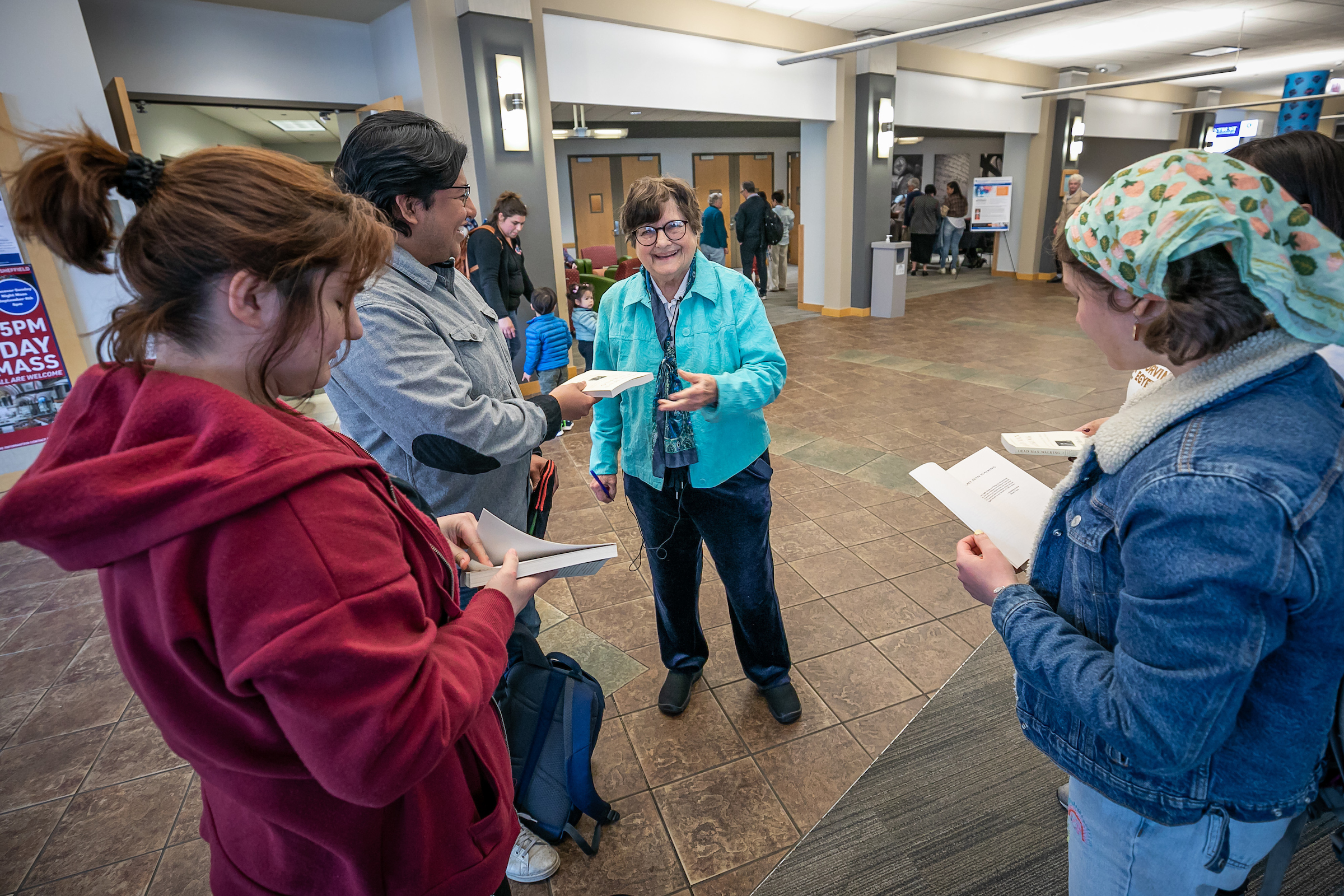 Sister Helen Prejean, CSJ, an internationally known activist and author, made her annual visit to DePaul's campus last week from her home in New Orleans for a series of open public lectures and classroom discussions. Sr. Helen participated April 21-27 in a number of speaking engagements, including a joint address with Barbara Crain Major, a community organizer, educator, author, activist and core anti-racism trainer. She also joined a panel with leaders from the Illinois Prison Project, the Chicago Coalition for the Homeless, the Visiting Room Project and the Youth Empowerment Performance Project for a transformative conversation about criminalization, transformation, survival and resistance. Sr. Helen visited classes and, to close out the week, preached at Sunday-evening Mass at St. Vincent de Paul Parish and spoke to faculty and staff at a Lunch with Vincent gathering. Sr. Helen wrote the widely acclaimed book "Dead Man Walking" and is known for her work as an educator about the death penalty and a counselor for inmates on death row.