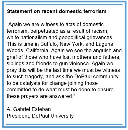 God of many names, bless those who endure racialized and other forms of violence. Bless the families who are dealing with fresh grief from the loss of those they loved, and comfort and strengthen and free those faced with ongoing and terrible consequences of institutionalized racism and other forms of oppression.God grant us the clarity and courage to be lights. To take actions to sow love and to combat hatred. May DePaul be an educational institution that seeks to preserve the dignity of every person at our university and all people throughout the world. Help us stand in solidarity and commit to doing what must be done to end hate and violence directed at communities already systemically on the margins. Amen.