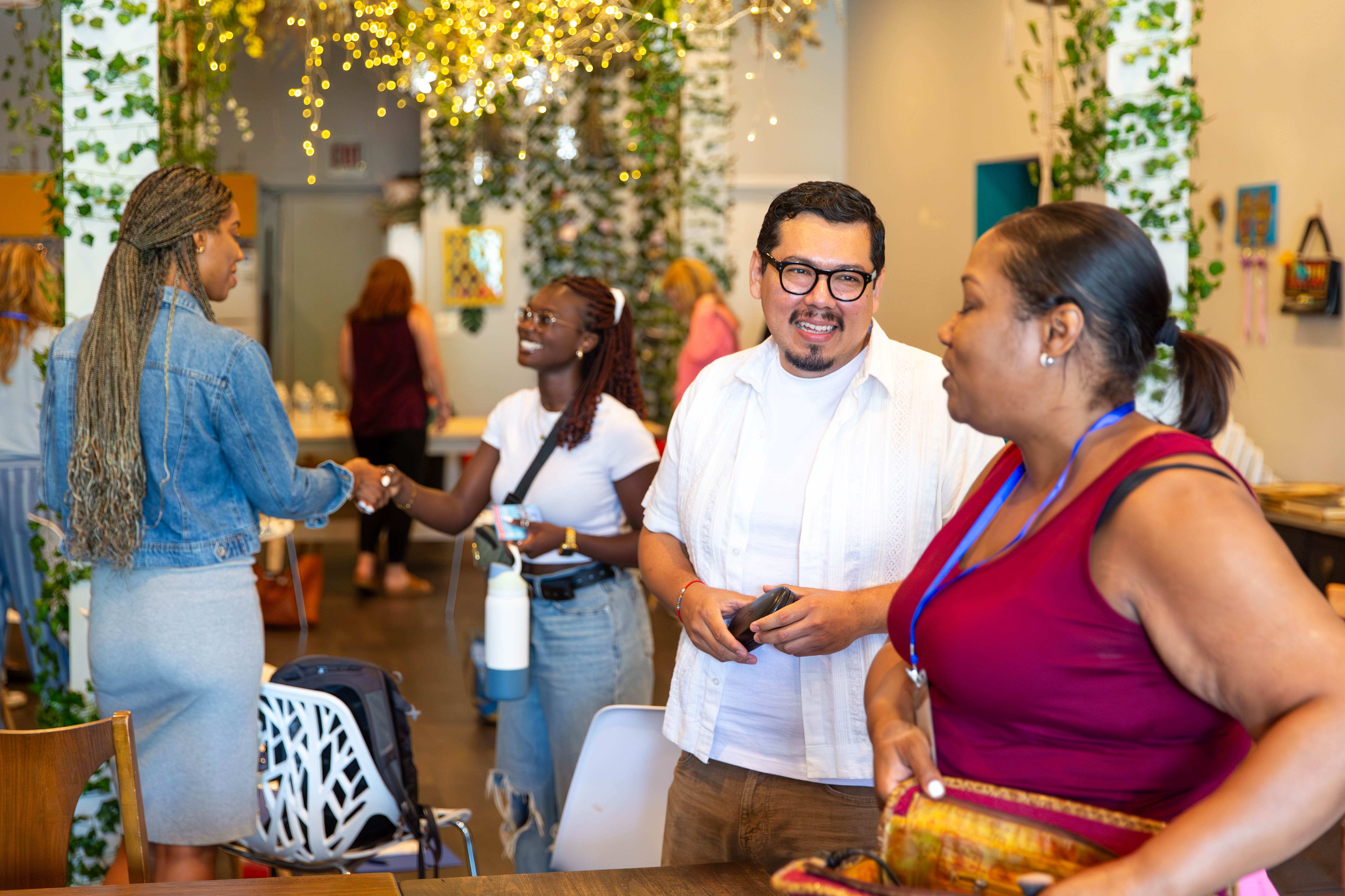 Participants engage in conversation inside The Honeycomb Project during the Faculty Immersion Institute. (Photo by Keeton Holder/DePaul University)
