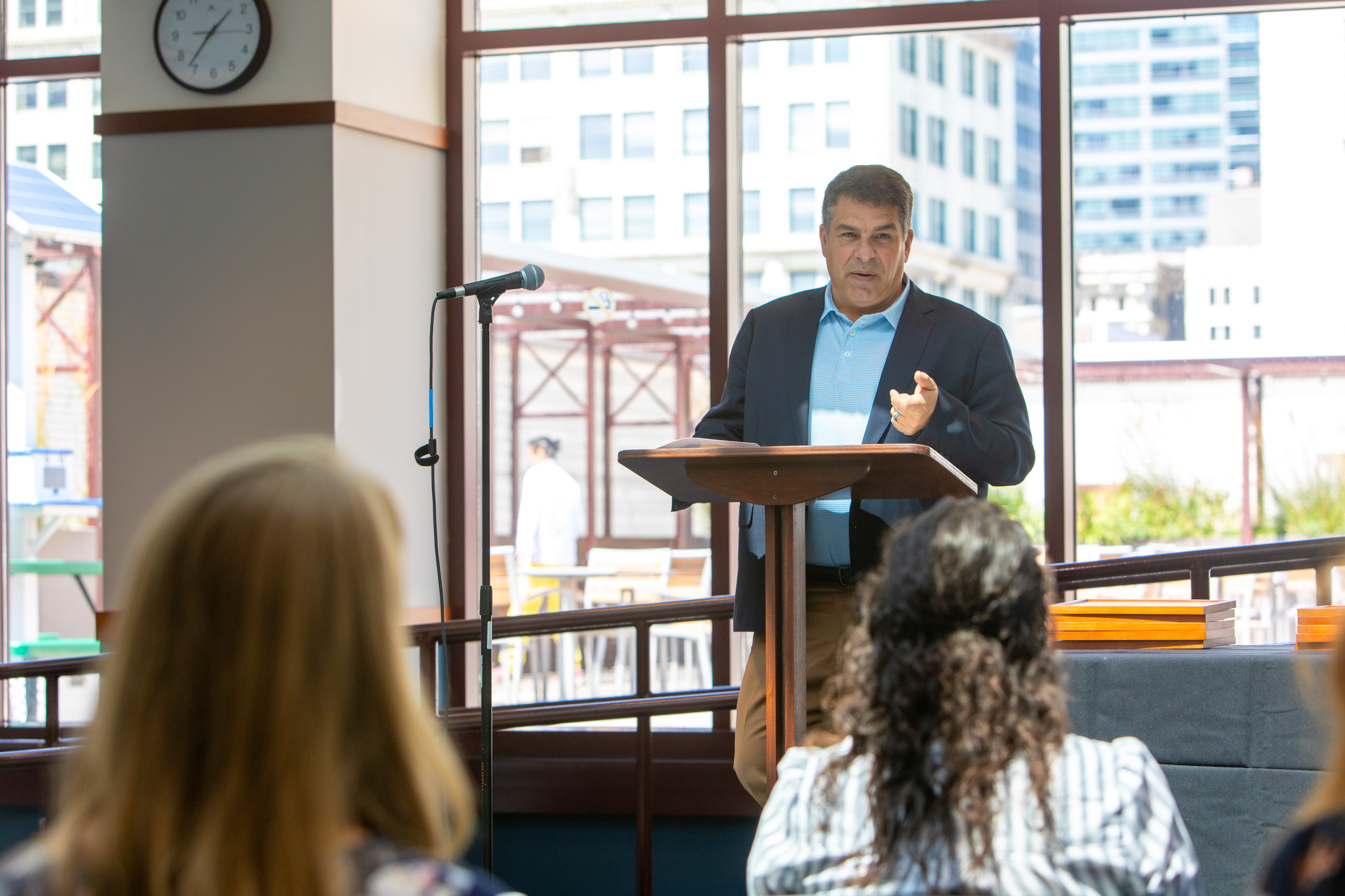 President Rob Manuel speaks to faculty at the BUILD graduation. (Photo by Keeton Holder/DePaul University)