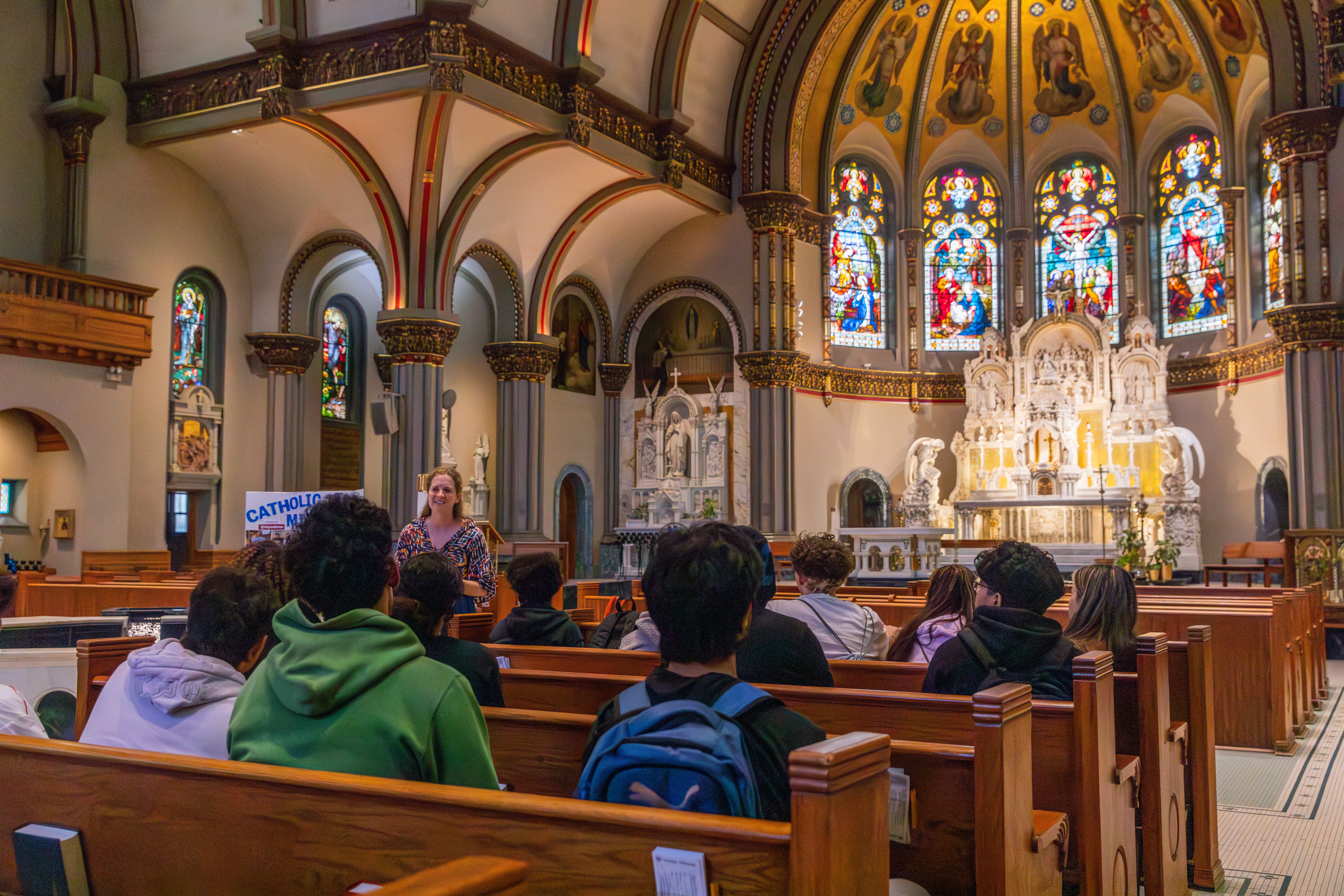 New students take a moment to observe the beautiful space of St. Vincent de Paul Church. (Photo by Keeton Holder/DePaul University)
