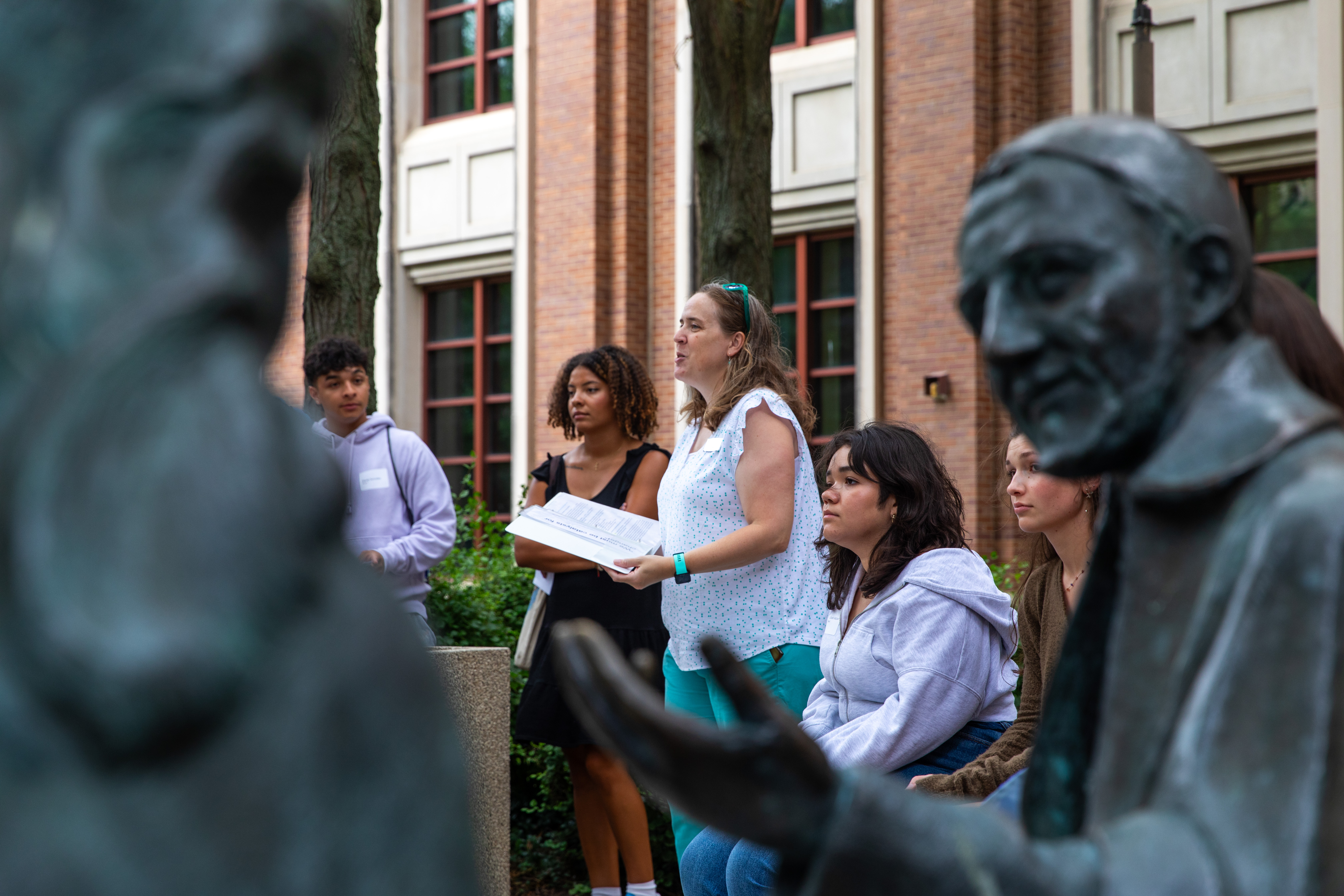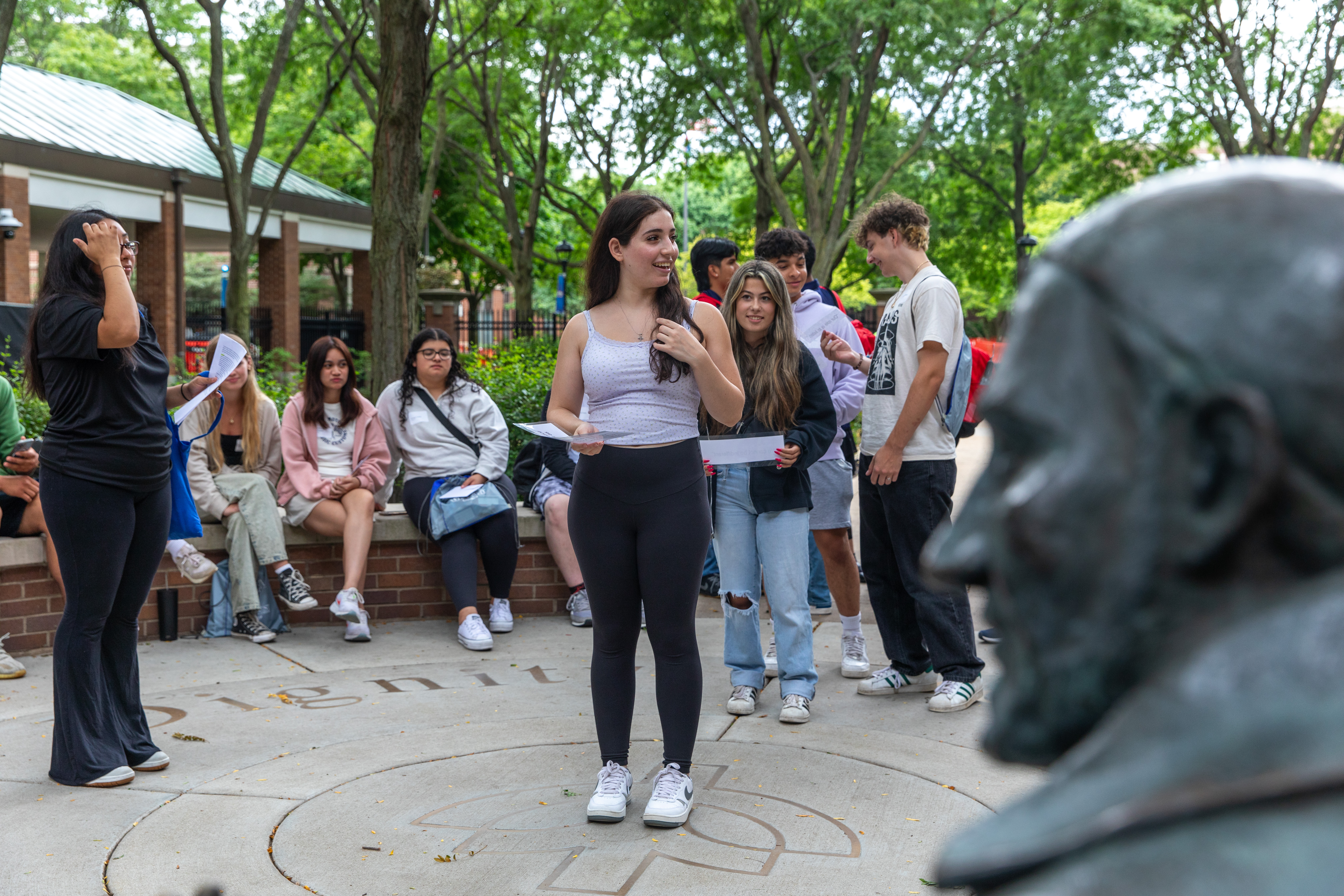 A new student hears her voice echo off the St. Vincent de Paul statue. (Photo by Keeton Holder/DePaul University)
