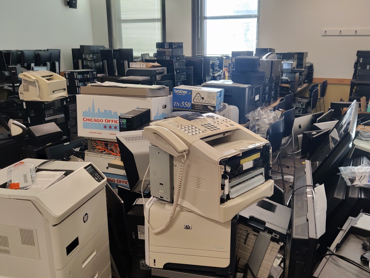 Fifty-one DePaul departments dropped off technology at the Loop and Lincoln Park campuses, donating more than 1,100 computers, 400 monitors and various scanners, mobile phones and fax machines. Departments also came across unique devices like 3D printers and an embroidery machine. This cross-departmental initiative took just one month, with IS and FO also playing crucial roles.