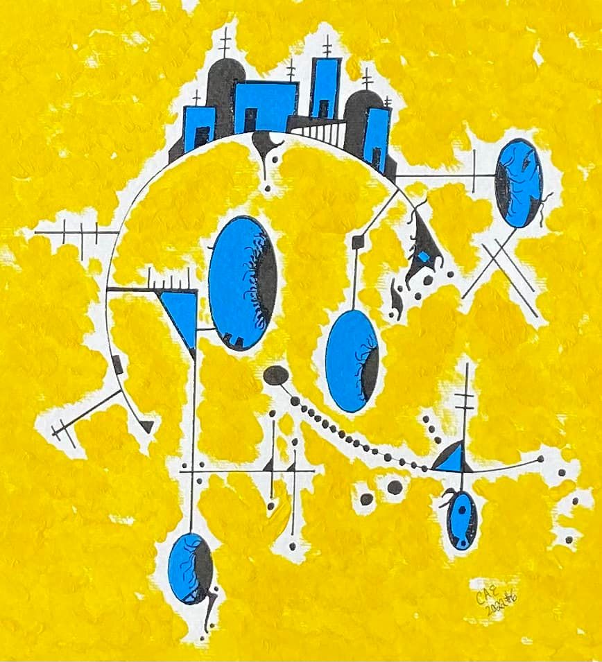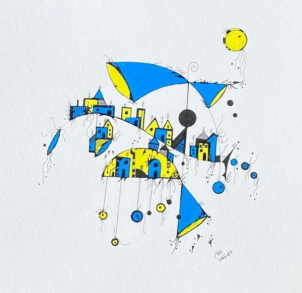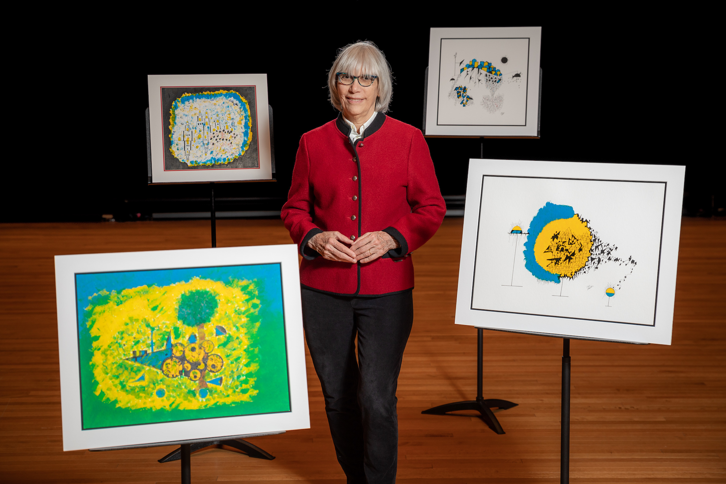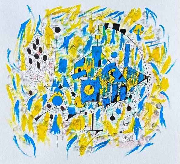When Russia invaded Ukraine on Feb. 24, 2022, Elias, like much of the rest of the world, watched in horror at the immense suffering of the Ukrainian people. Inspired by Vincentian ideals, she reacted by sponsoring families through philanthropies like the $1K Project Ukraine. Then last summer, at "Piano di Casciana" outside Lucca, Italy, where she spends every summer, she felt compelled to create "Ukraine, When God Is Silent," a collection of 17 abstract paintings. The medium is acrylics and watercolor, with the blue and yellow of Ukraine's flag serving as the common theme throughout. The title is taken from an inscription made by Jewish people hiding in a cellar in Cologne, Germany, under Nazi control: "I believe in the sun, though it be dark; I believe in God, though He be silent; I believe in neighborly love, though it be unable to reveal itself."