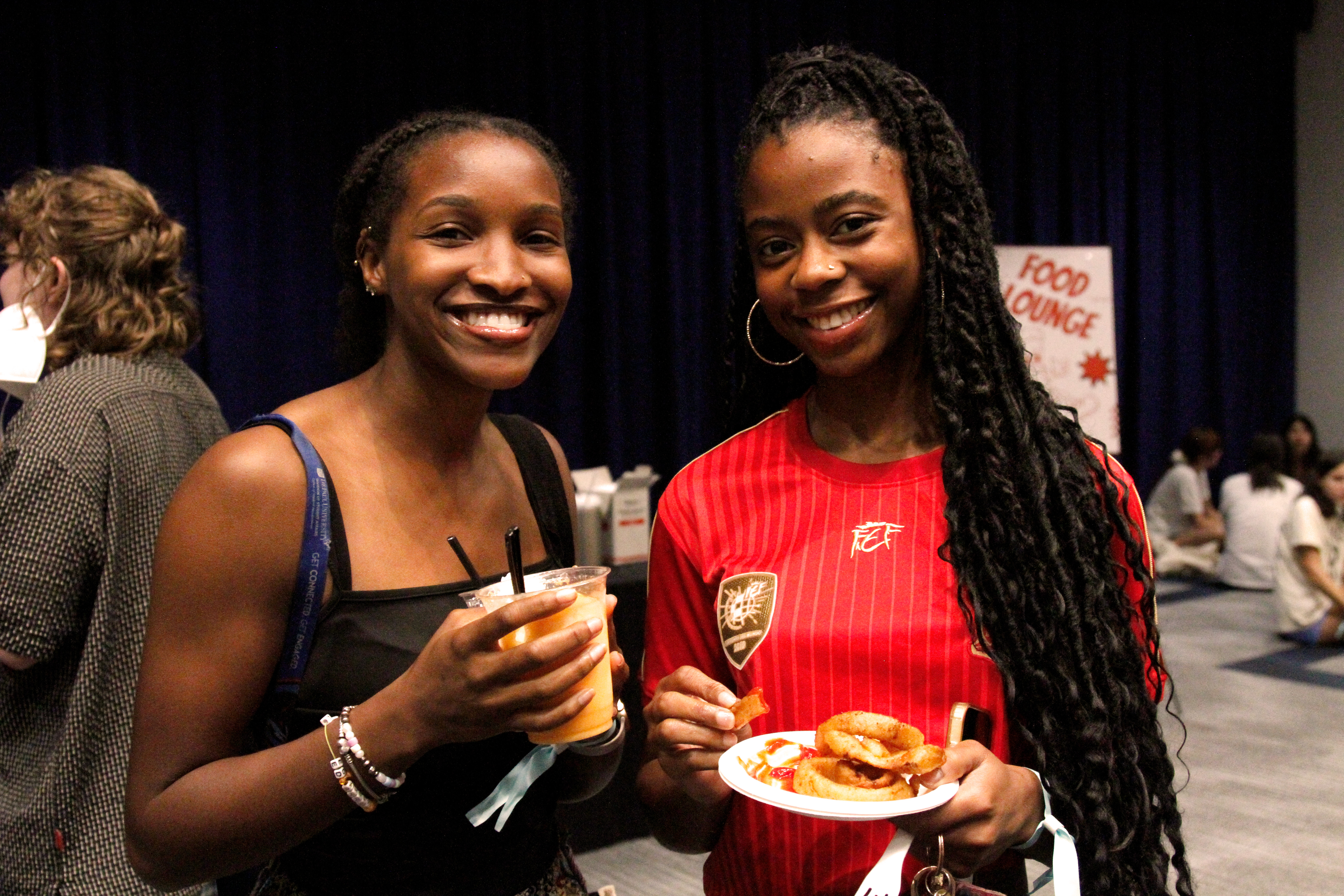 A pair of students pose for a photo before eating at the DePaul After Dark: STU Takeover. (Photo by Aubreonna Chamberlain/DePaul University)