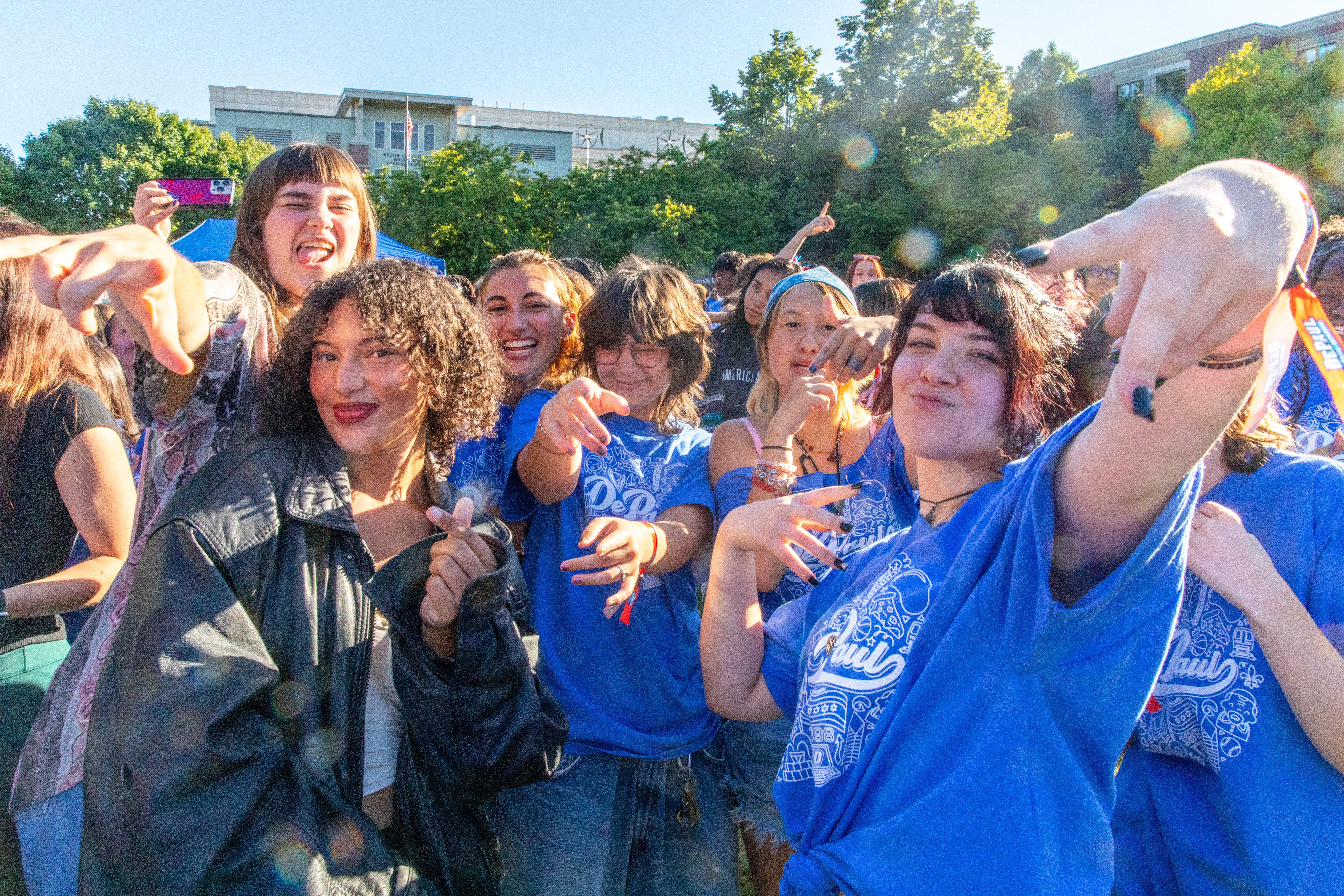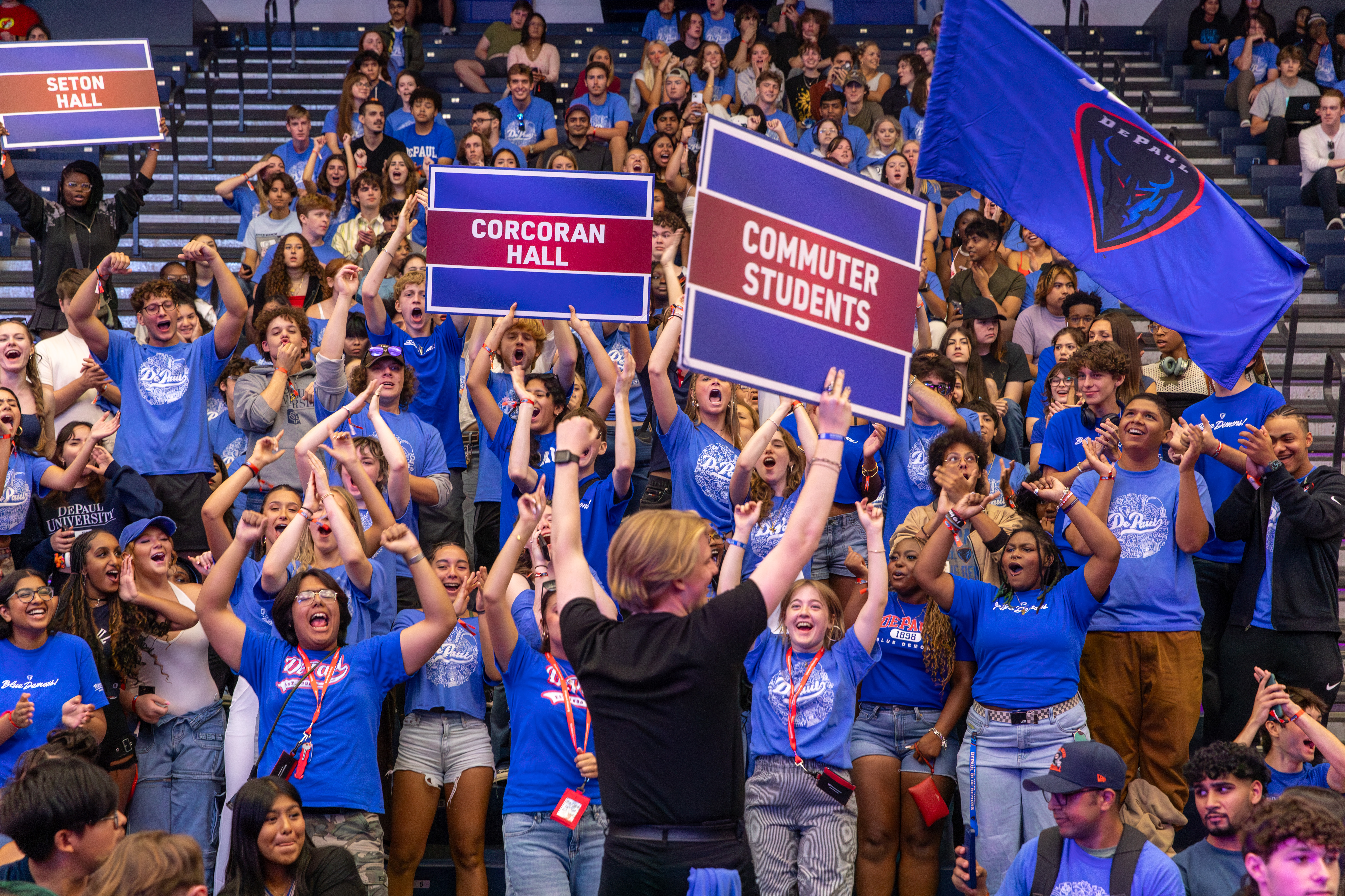 First-year students from Corcoran Hall sound off during the Blue Demon Welcome. (Photo by Keeton Holder/DePaul University)