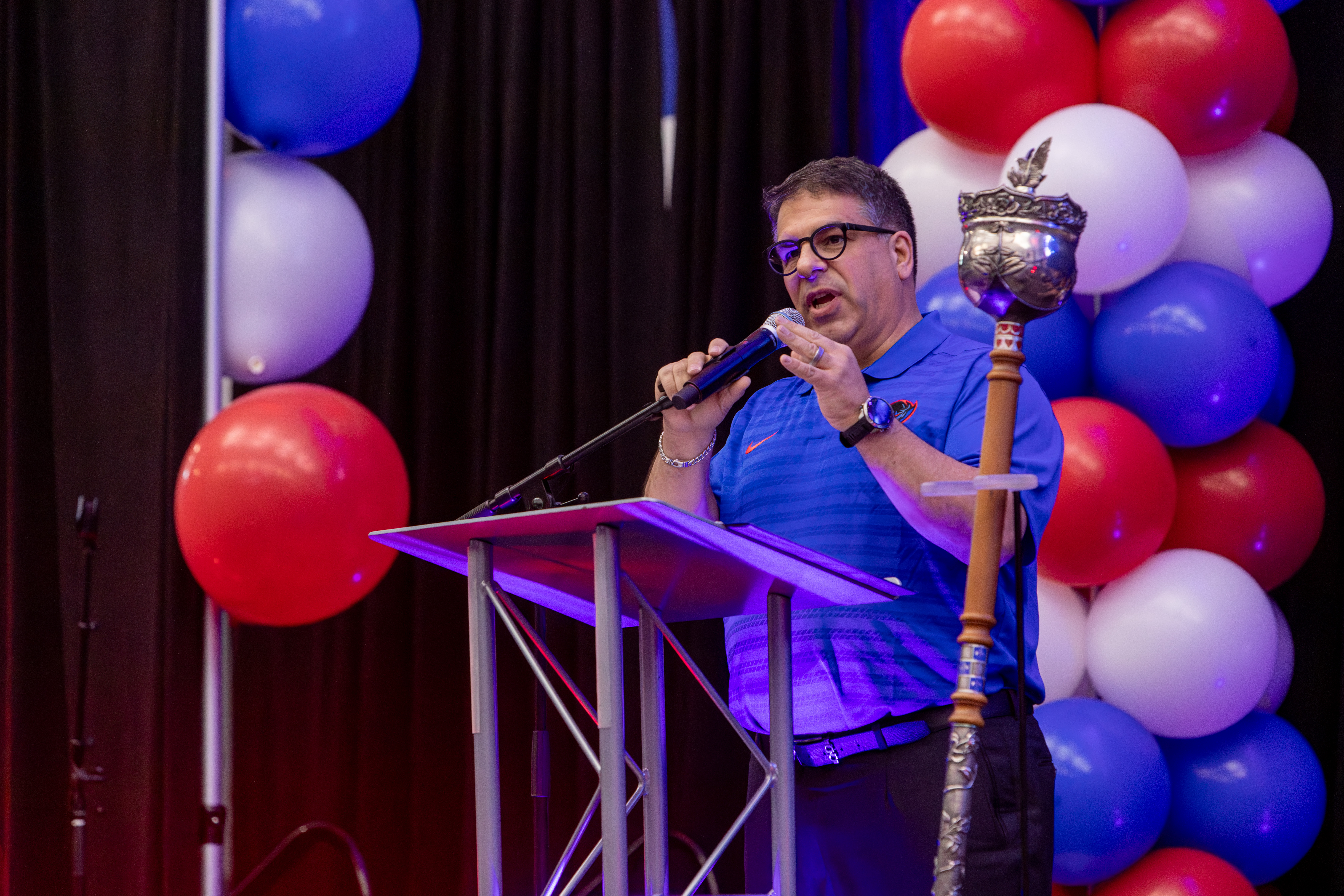 President Rob Manuel welcomes students to DePaul during the Blue Demon Welcome Ceremony. (Photo by Keeton Holder/DePaul University)