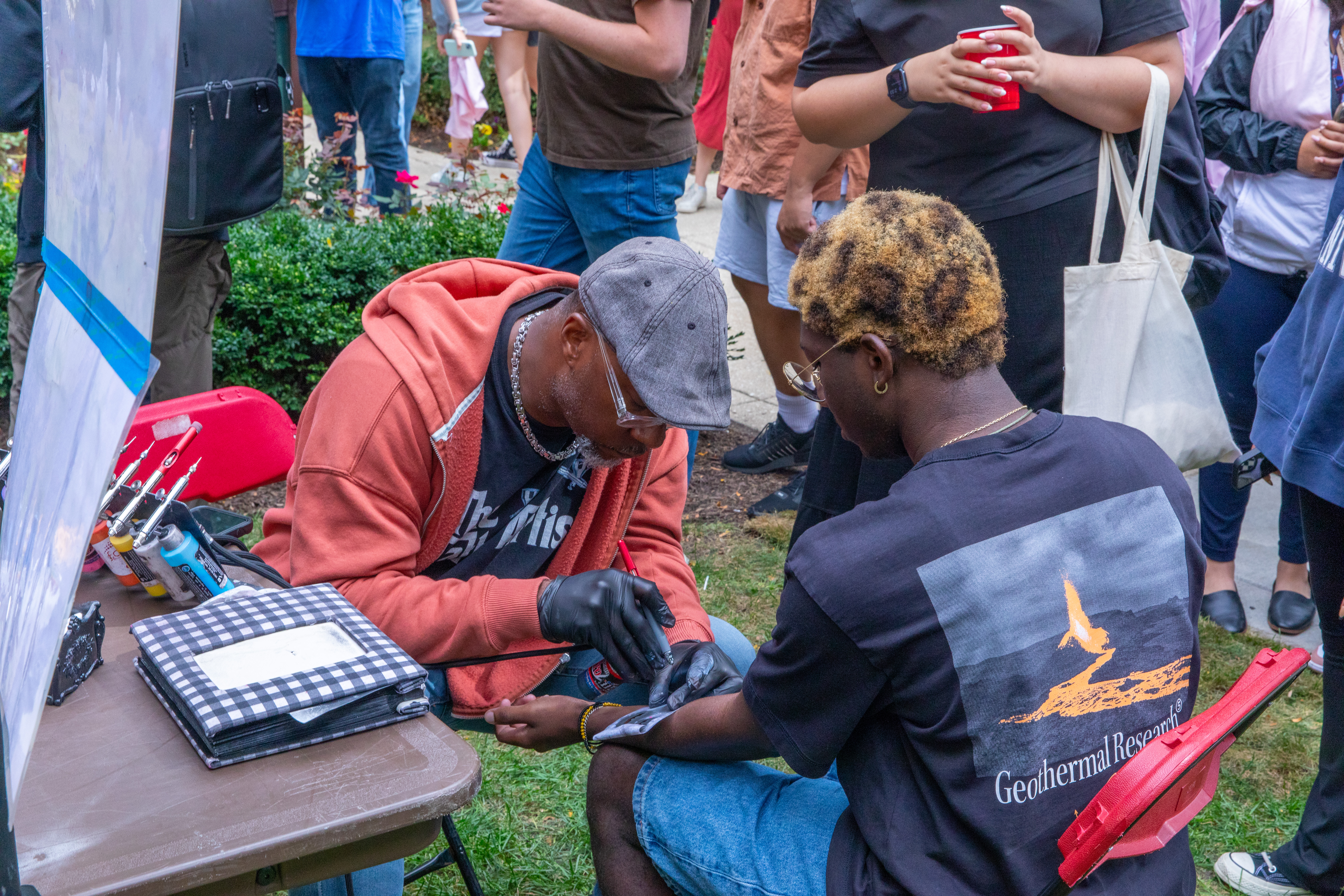 A students receives an airbrush tattoo from an artist at the Lincoln Park Involvement Fair. (Photo by Keeton Holder/DePaul University)