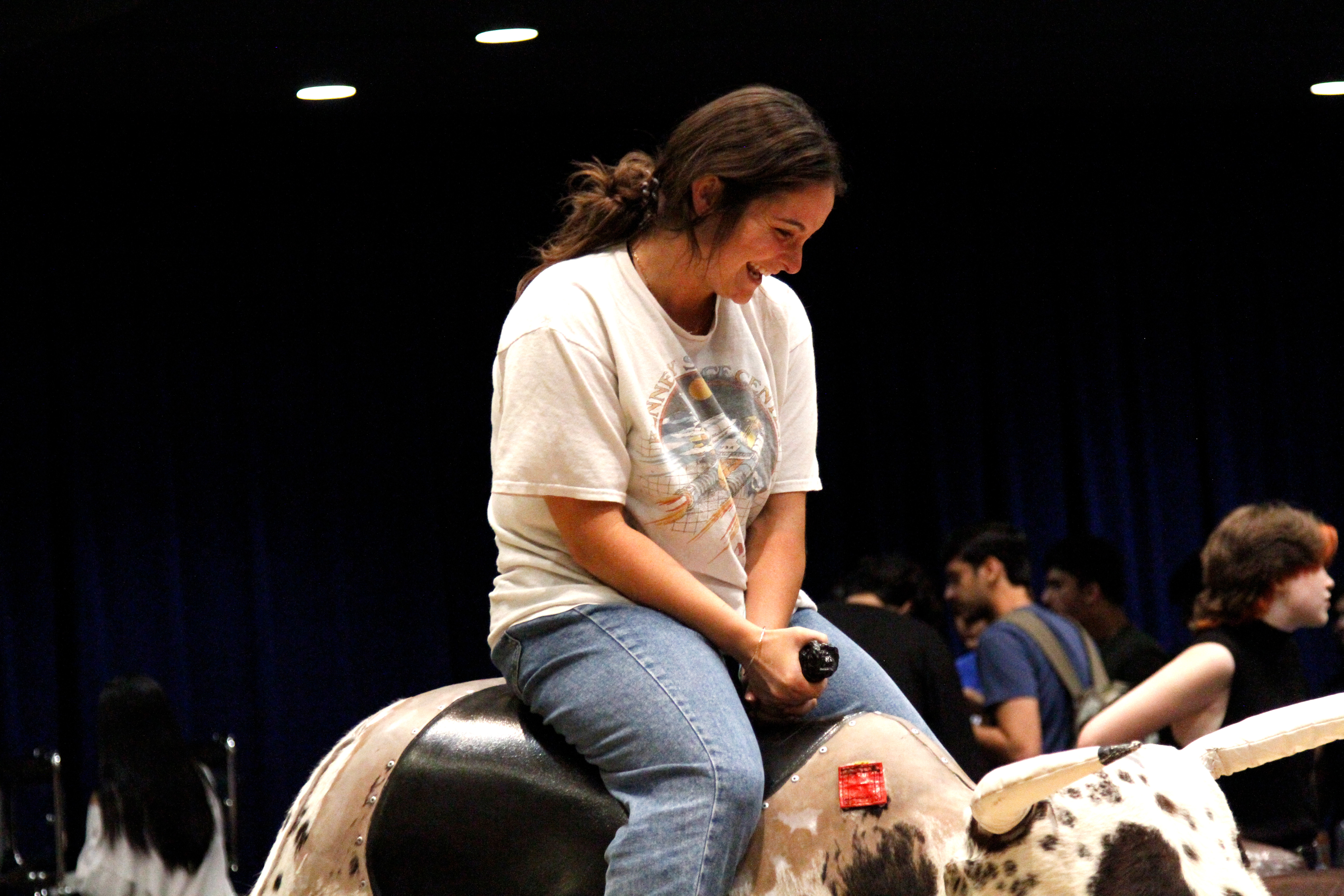 A student rides a mechanical bull at DePaul After Dark: STU Takeover. (Photo by Aubreonna Chamberlain/DePaul University)